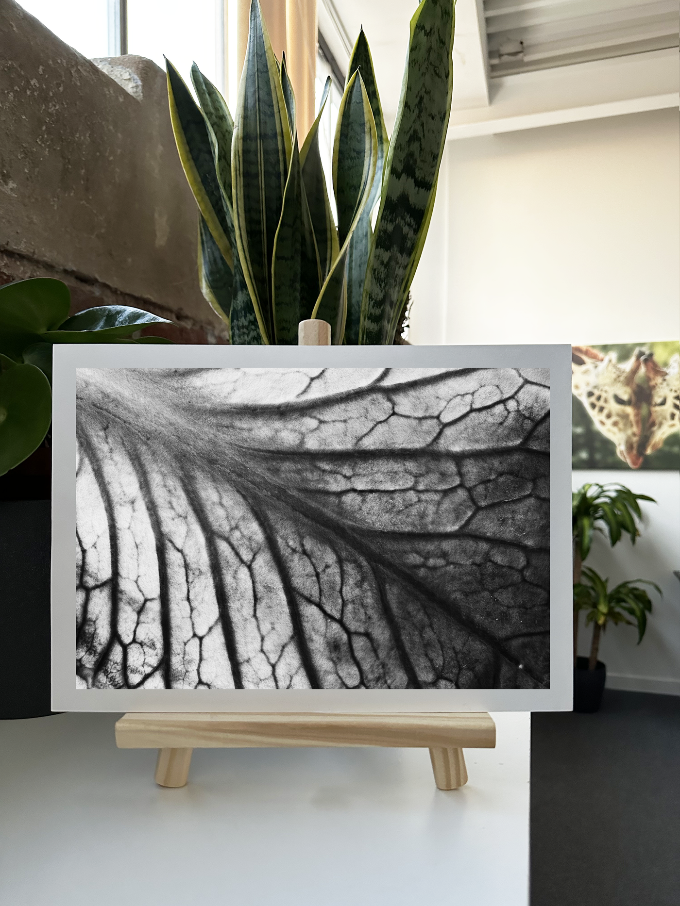 When presented on our premium Fine Art print paper, this botanical masterpiece achieves an extraordinary level of visual impact. The matt finish dramatically enhances the textures of both the light & dark tones, while the Monochromatic gradients create an almost three-dimensional effect that brings new life to the leaf's internal landscape. The way light interacts with our Fine Art print adds an extra dimension to the viewing experience, making the leaf's structure appear to glow from within, much like it might appear when held up to natural sunlight. This stunning piece would be particularly effective in contemporary spaces where its vibrant Monochromatic tones and natural patterns can create maximum impact, from a modern home to a medical office or botanical institution.