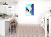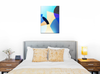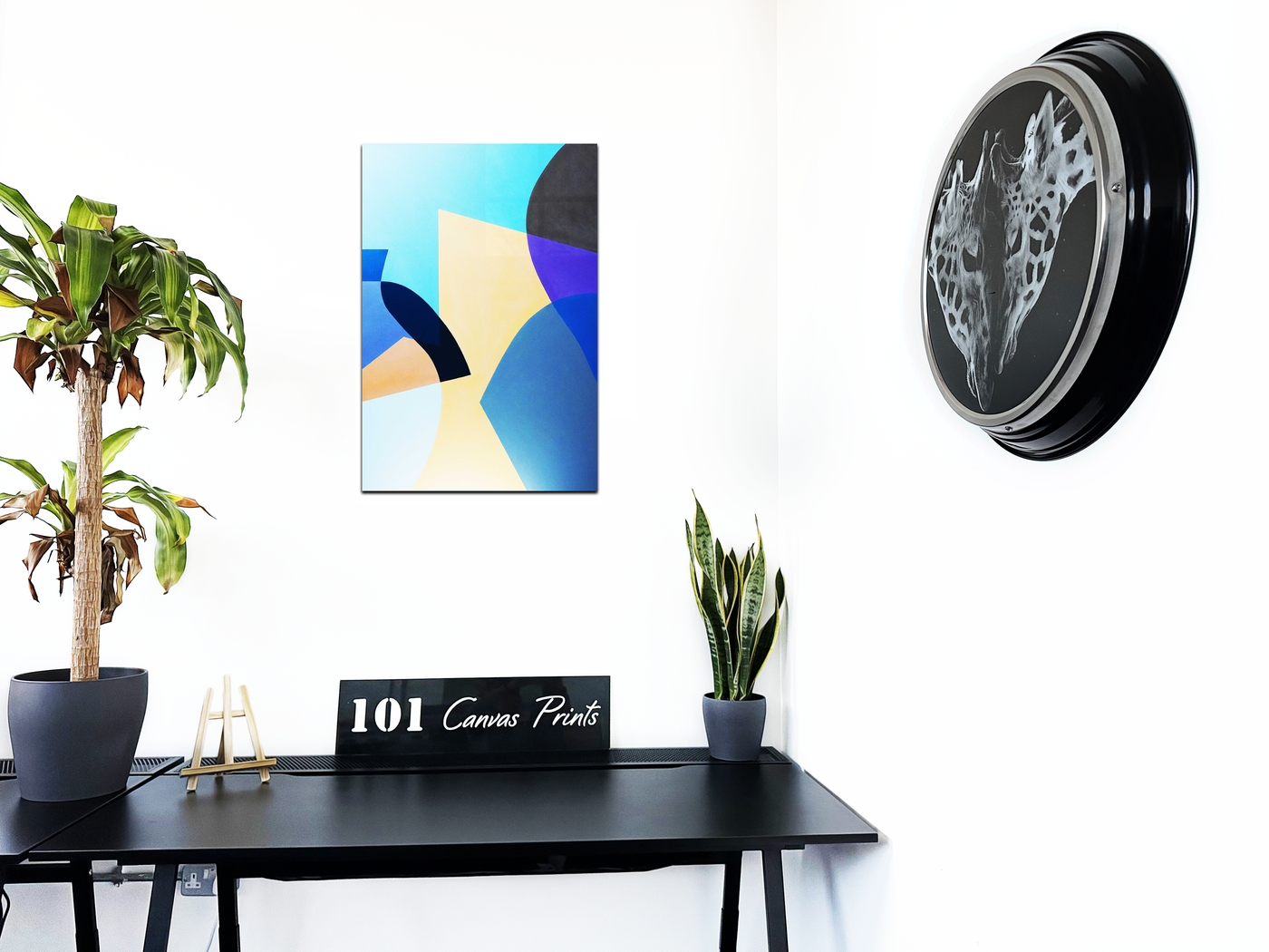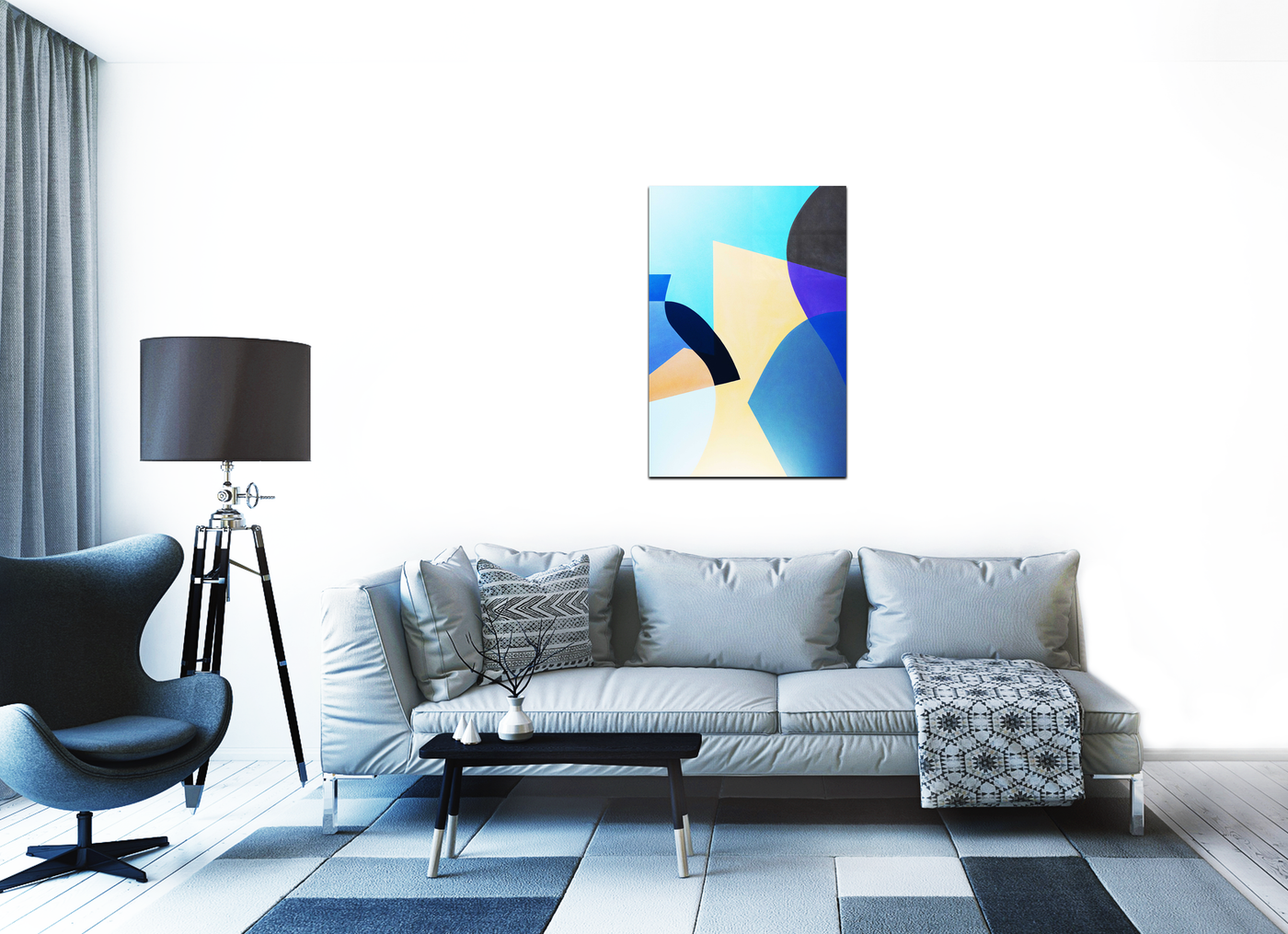 The artist's sophisticated use of colour creates a serene visual impact, with a carefully curated palette of blues ranging from bright aqua to deep navy, balanced by warm neutral tones. Through our precise photography and print enhancement process, we've maintained the crisp definition between colour fields while preserving the subtle tonal variations that give each shape its distinctive character. The result is an image that combines geometric precision with artistic sensitivity.