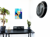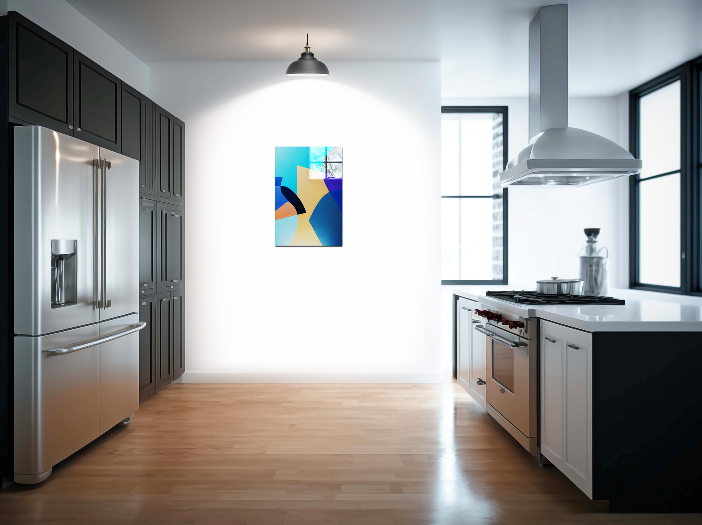 The artist's sophisticated use of colour creates a serene visual impact, with a carefully curated palette of blues ranging from bright aqua to deep navy, balanced by warm neutral tones. Through our precise photography and print enhancement process, we've maintained the crisp definition between colour fields while preserving the subtle tonal variations that give each shape its distinctive character. The result is an image that combines geometric precision with artistic sensitivity.