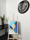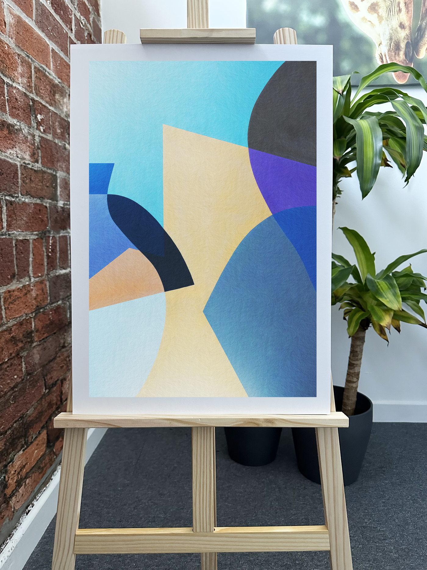 The artist's sophisticated use of colour creates a serene visual impact, with a carefully curated palette of blues ranging from bright aqua to deep navy, balanced by warm neutral tones. Through our precise photography and print enhancement process, we've maintained the crisp definition between colour fields while preserving the subtle tonal variations that give each shape its distinctive character. The result is an image that combines geometric precision with artistic sensitivity.