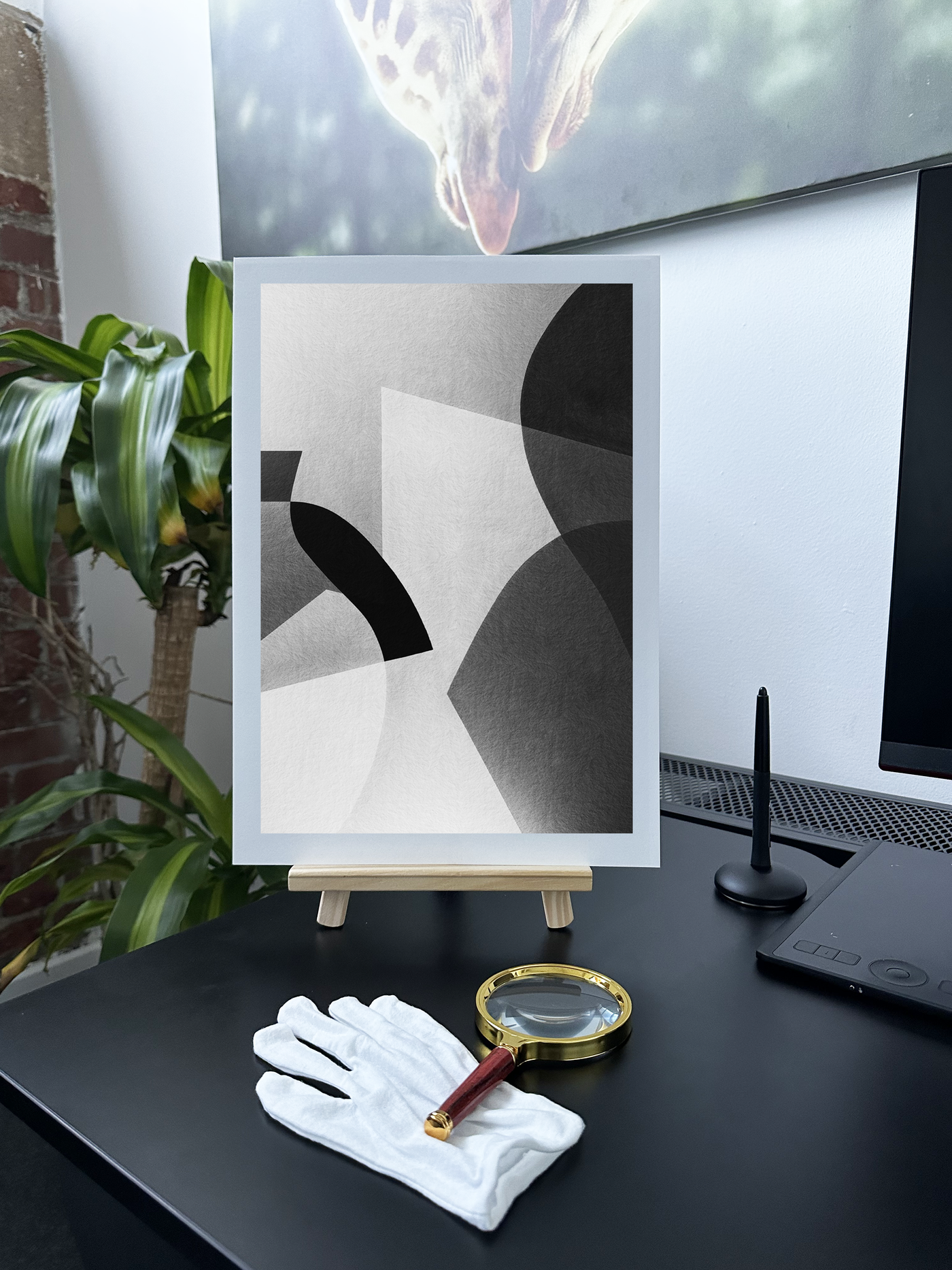 Reproduced on our premium Fine Art paper, this geometric study takes on an additional layer of artistic refinement. The natural, matte finish of the Fine Art paper softens the clean lines just enough to create a sophisticated gallery-quality appearance while maintaining the crisp definition between shapes. This piece would make a striking addition to any modern interior, particularly in spaces where its calm sophistication and architectural quality can enhance the overall design aesthetic.