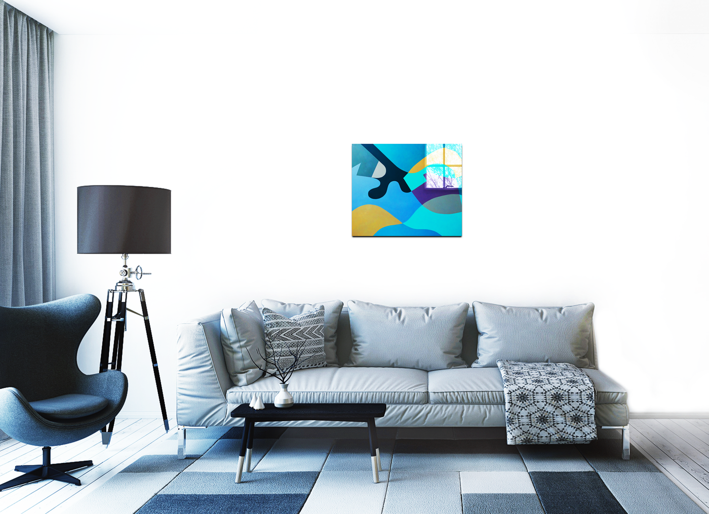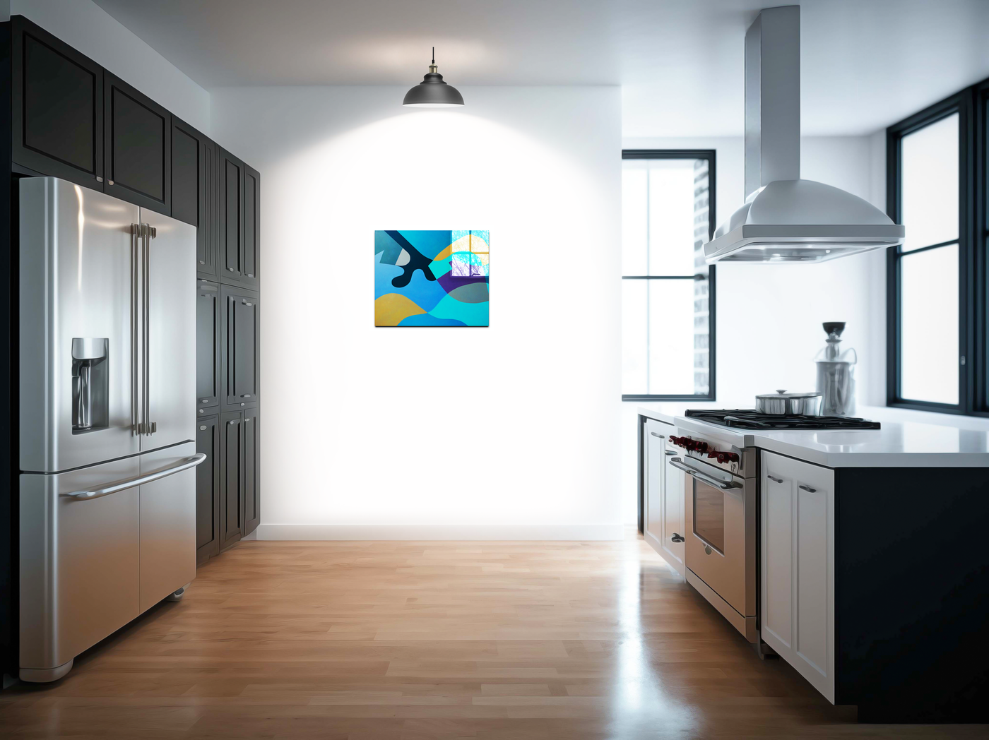 When presented in our premium Acrylic medium, this coastal study achieves an extraordinary level of visual depth. The high-gloss finish dramatically enhances the maritime blues while creating crystal-clear definition between shapes. The way light interacts with our Acrylic prints adds an extra dimension to the viewing experience, making the forms appear to float like waves caught in motion. This stunning piece would be particularly effective in contemporary spaces where its oceanic palette and flowing forms can create maximum impact.