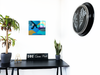 The artist's sophisticated use of colour creates a serene visual impact, with a carefully curated palette that ranges from deep navy to bright turquoise, complemented by sandy golds and a striking purple accent. Through our precise photography and print enhancement process, we've maintained the clean definition between colour fields while preserving the subtle variations that give each shape its distinctive character. The result is an image that combines geometric precision with natural fluidity.