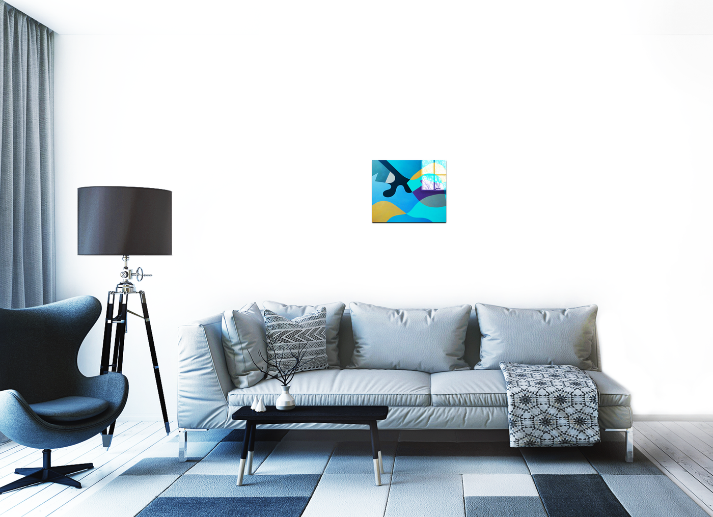 The artist's sophisticated use of colour creates a serene visual impact, with a carefully curated palette that ranges from deep navy to bright turquoise, complemented by sandy golds and a striking purple accent. Through our precise photography and print enhancement process, we've maintained the clean definition between colour fields while preserving the subtle variations that give each shape its distinctive character. The result is an image that combines geometric precision with natural fluidity.