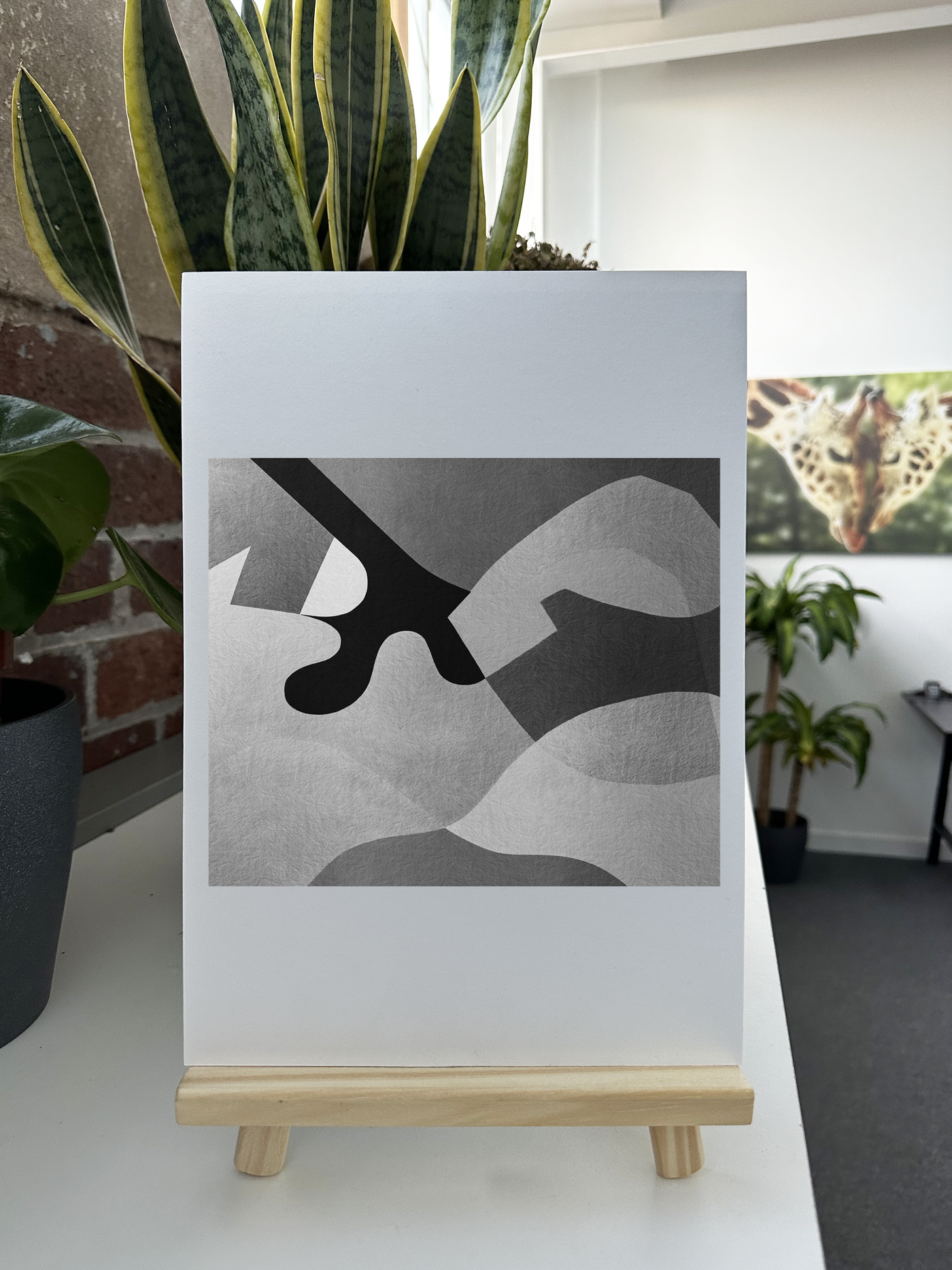 The Monochrome palette draws directly from nature's seaside spectrum, combining various shades from light to dark that add depth and sophistication. Our print enhancement team have preserved the precise edges between each Monochromatic field while maintaining the subtle gradients that give the piece its sense of depth and movement. Each shape seems to float and flow into the next, creating a continuous visual journey across the Fine Art print.