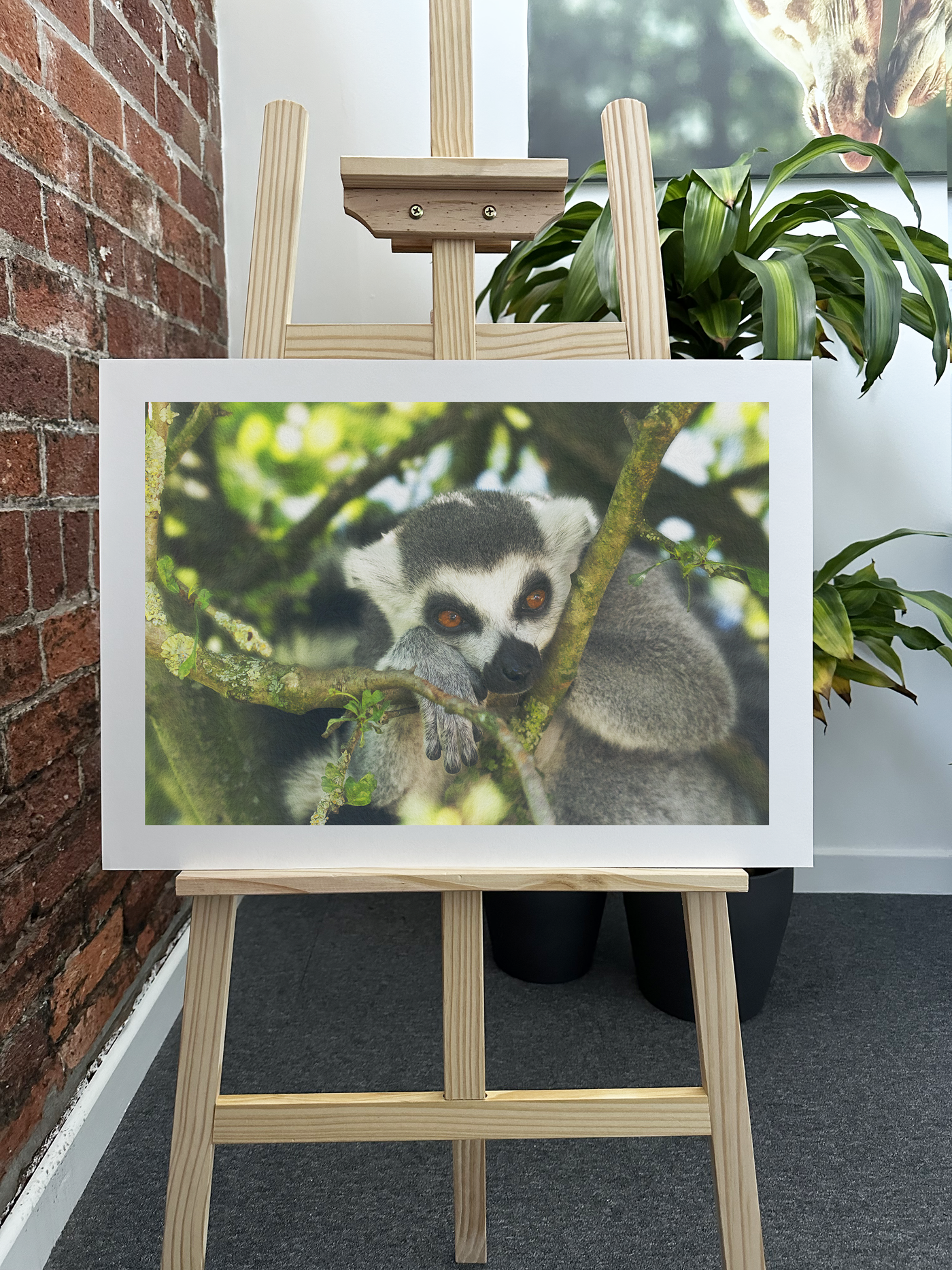 It features an idyllic portrait of a Ring-Tailed Lemur lying against two intersecting branches, with a bright blue sky and leafy green canopy in the background. This piece makes the perfect gift for animal lovers and those looking for that unique touch to their space.