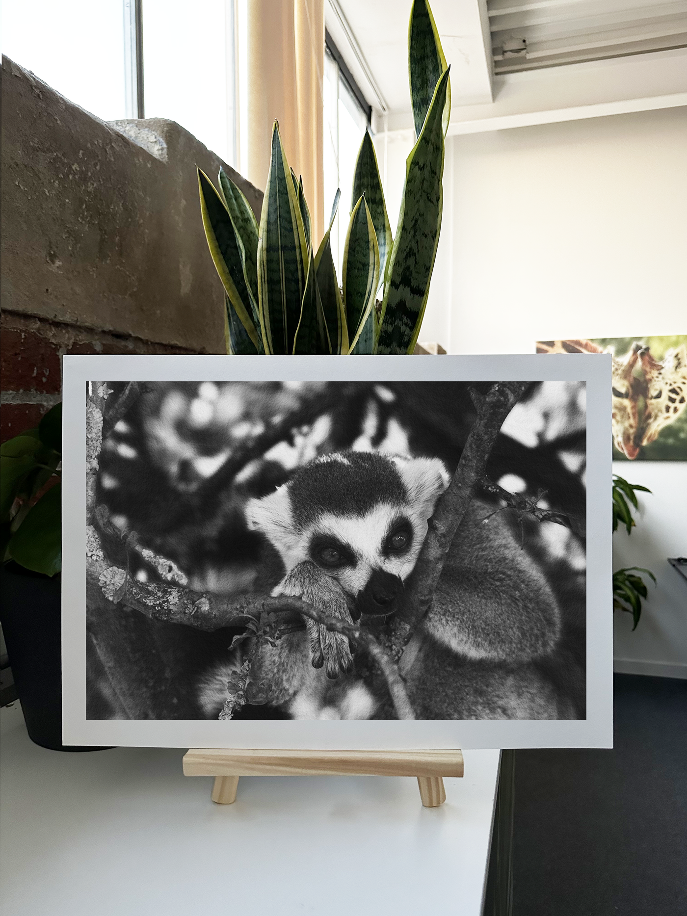 The Lemur Pondering Monochrome Fine Art Print is a beautiful piece of art that will stand out in any room and remind you of the wonders of the nature.