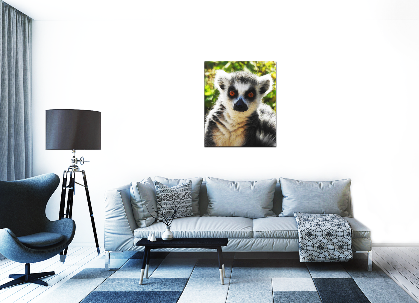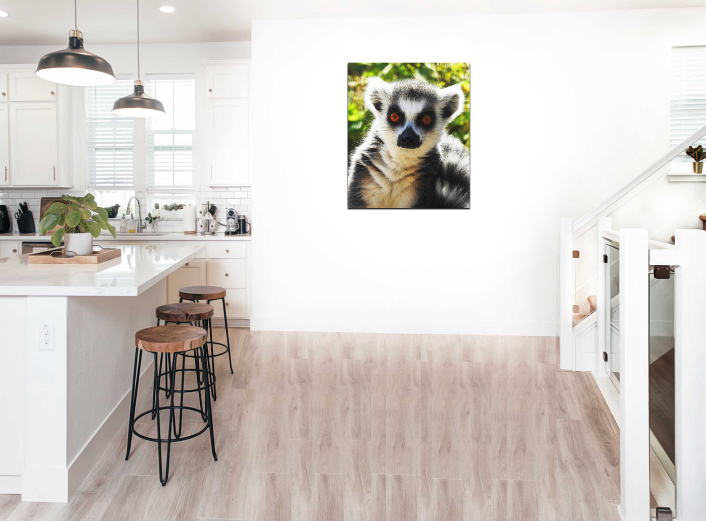 This Acrylic print is guaranteed to make a fun addition to your room, especially for animal lovers. The print features a lemur looking directly at the camera in stunning detail, against a blurred leafy background. This picture will look great on its own, or as part of an animal themed display.
