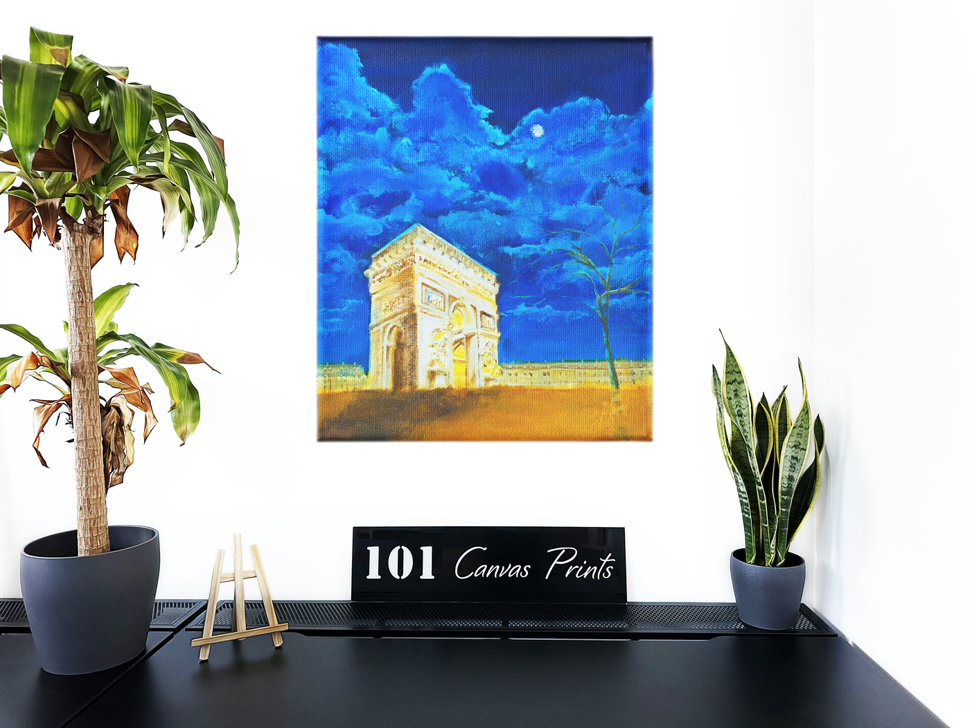 Masterfully captured by the 101 Canvas Prints photography team, "L'Etoile" presents a haunting vision of Paris's Arc de Triomphe. The iconic monument stands in majestic solitude against a dramatic night sky, its usual crowds notably absent. The artist has captured both the monument's eternal grandeur and the unprecedented quiet of this historic moment, creating a powerful meditation on isolation and resilience.