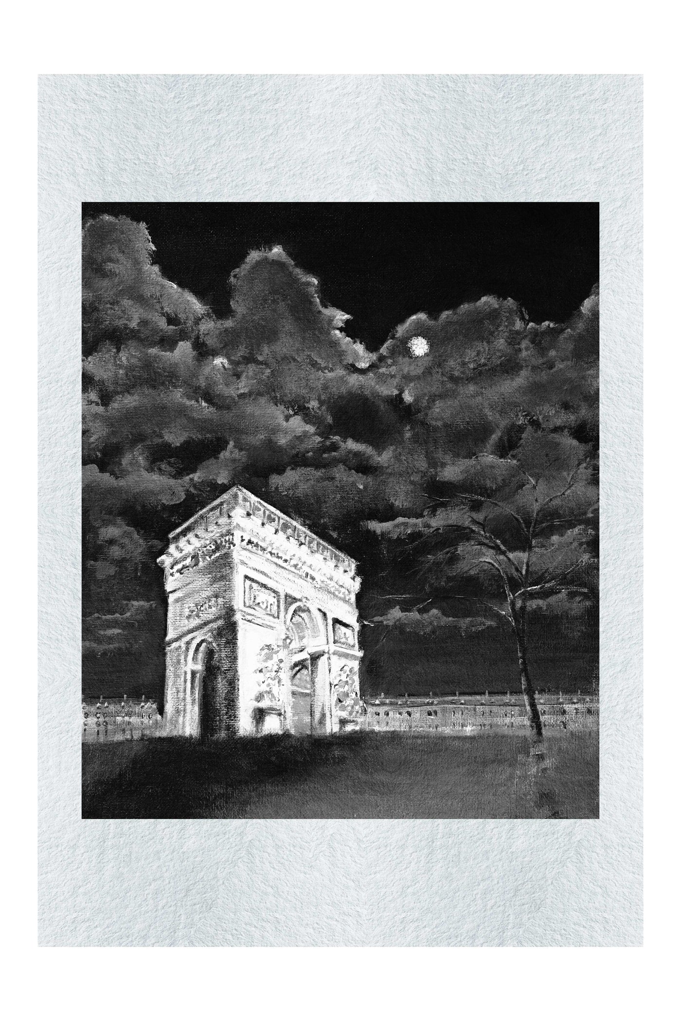 The Monochrome palette contrasts the warm, illuminated limestone of the Arc against an intensely deep tonal Parisian sky filled with billowing clouds. Our print enhancement team have preserved every nuance of light and shadow, from the subtle architectural details glowing in the evening light to the dramatic cloud formations that seem to echo the monument's sense of solitary dignity. A single delicate tree stands as silent witness to this unusual moment of stillness, while the bright light filtering through the arch suggests hope amid isolation.