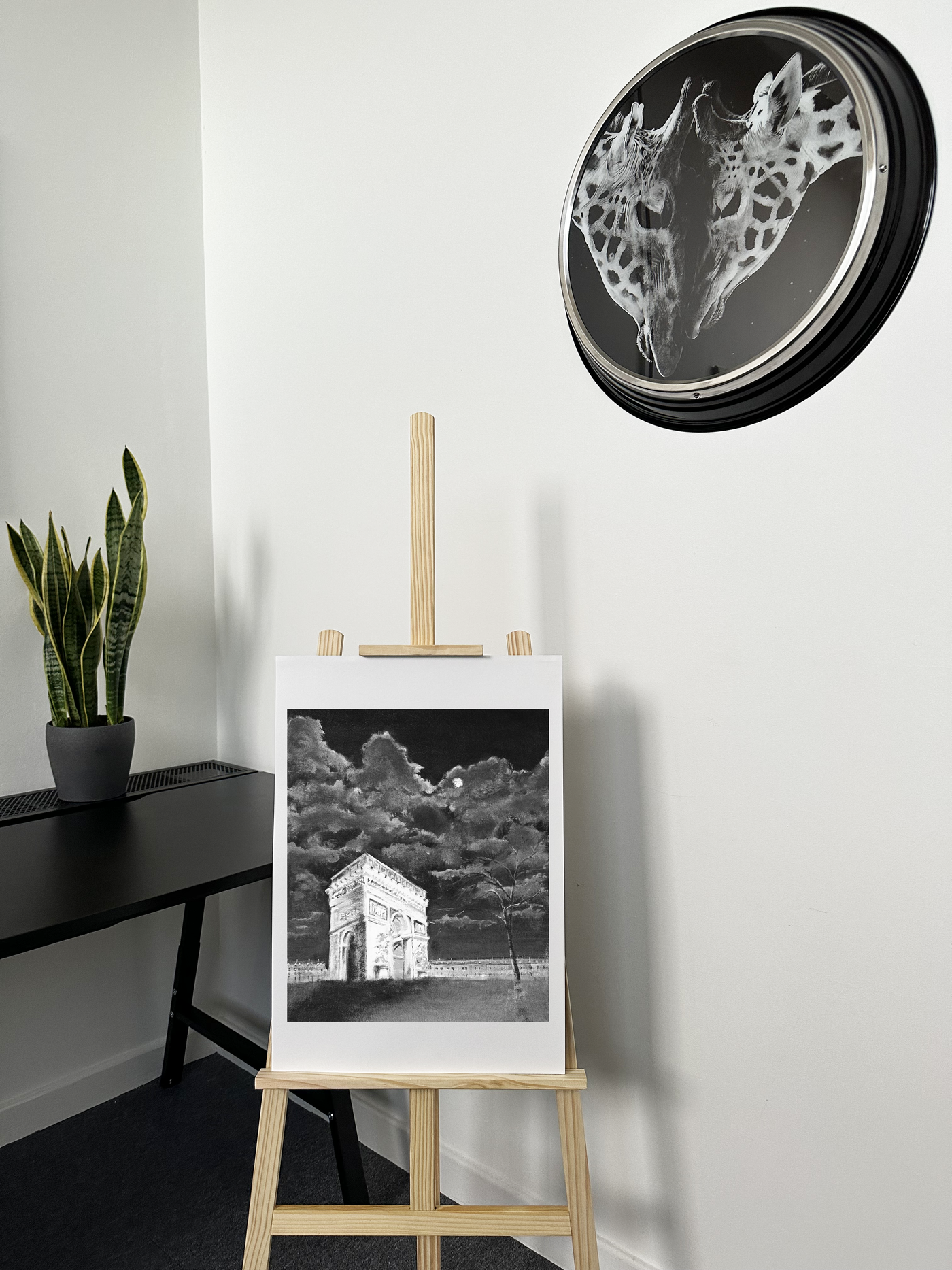 Reproduced on our premium Fine Art paper material, this study of solitude and strength takes on an additional layer of emotional resonance. The natural, matte finish of the Fine Art paper perfectly complements the painting's contemplative mood while maintaining the dramatic contrast between the illuminated monument and the deep Monochromatic tonal sky. This piece would make a powerful statement in any space where its themes of resilience and introspection during extraordinary times can resonate with viewers.