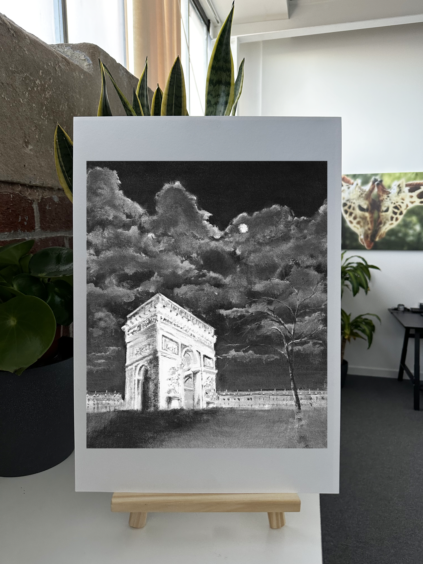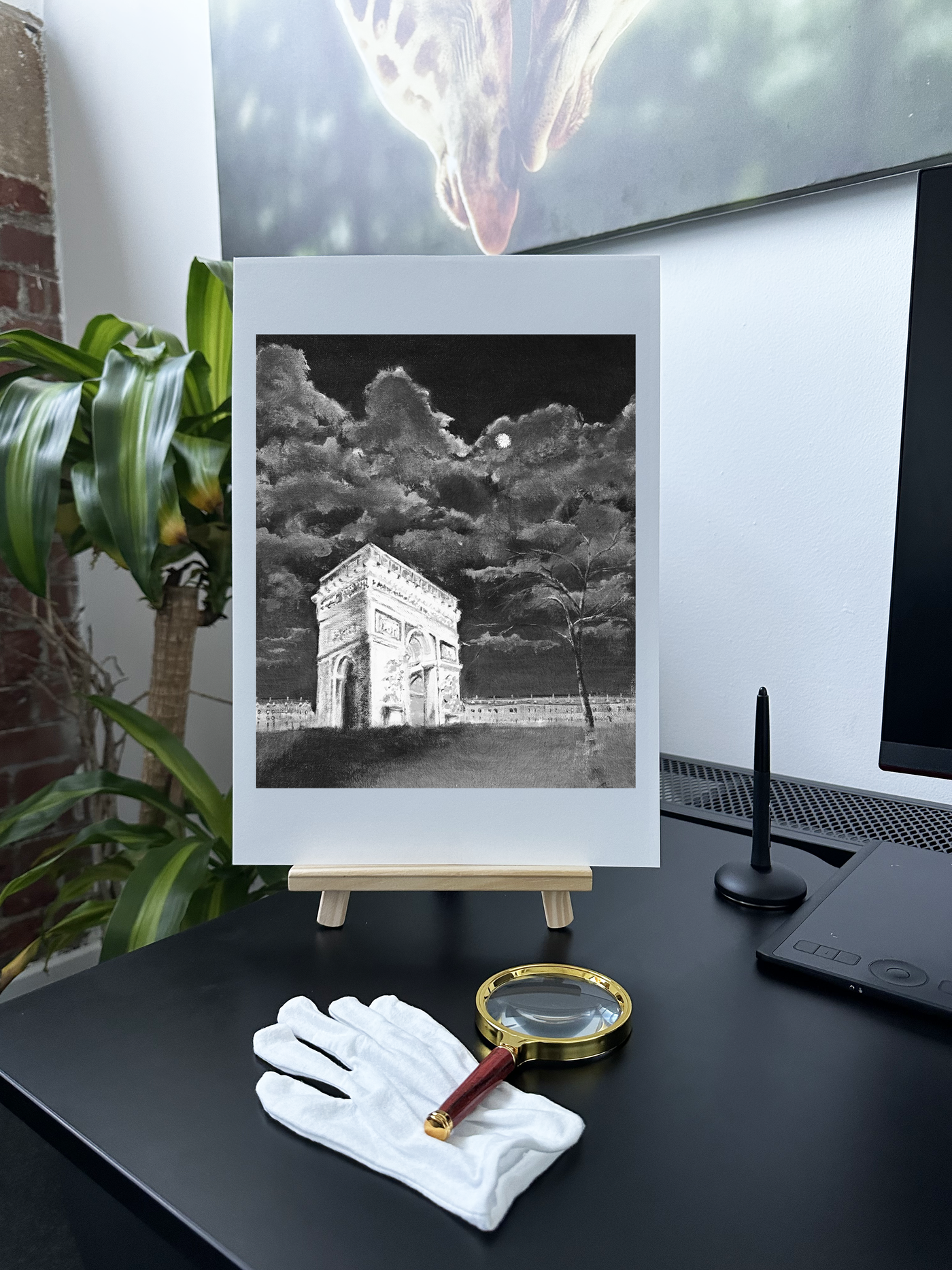 Reproduced on our premium Fine Art paper material, this study of solitude and strength takes on an additional layer of emotional resonance. The natural, matte finish of the Fine Art paper perfectly complements the painting's contemplative mood while maintaining the dramatic contrast between the illuminated monument and the deep Monochromatic tonal sky. This piece would make a powerful statement in any space where its themes of resilience and introspection during extraordinary times can resonate with viewers.