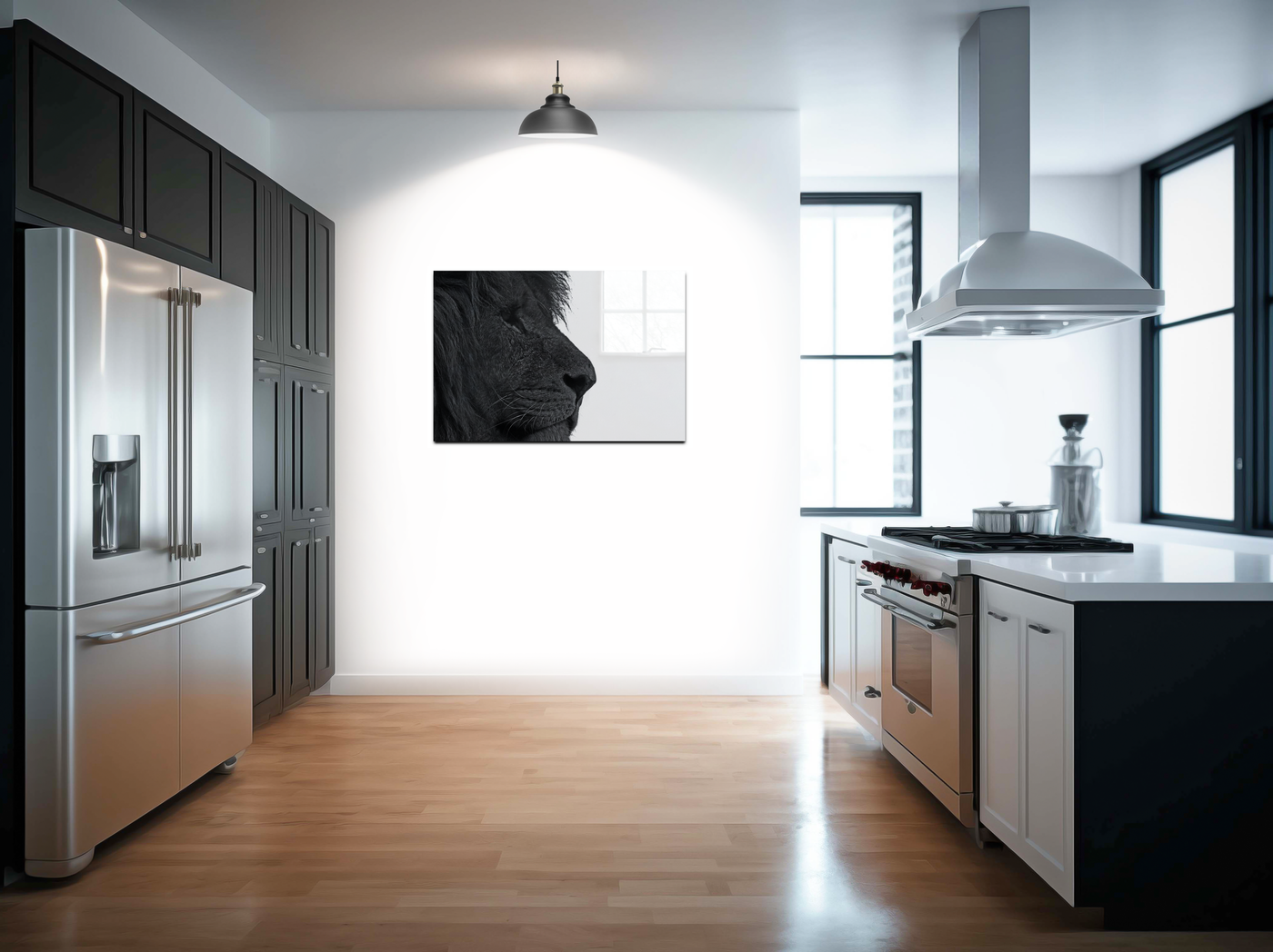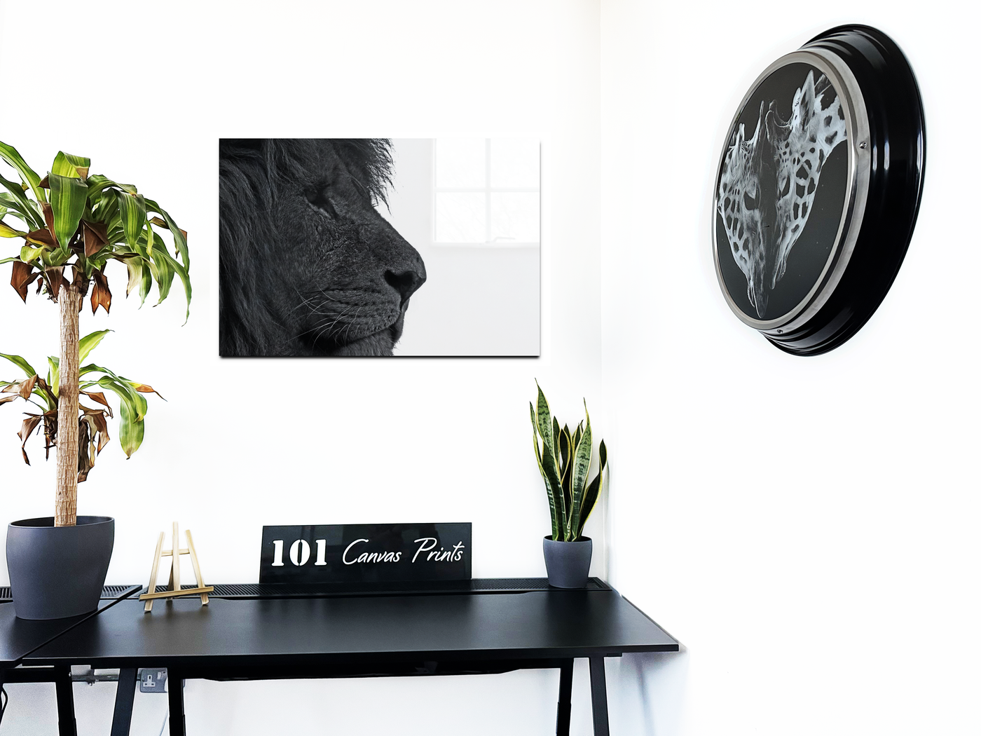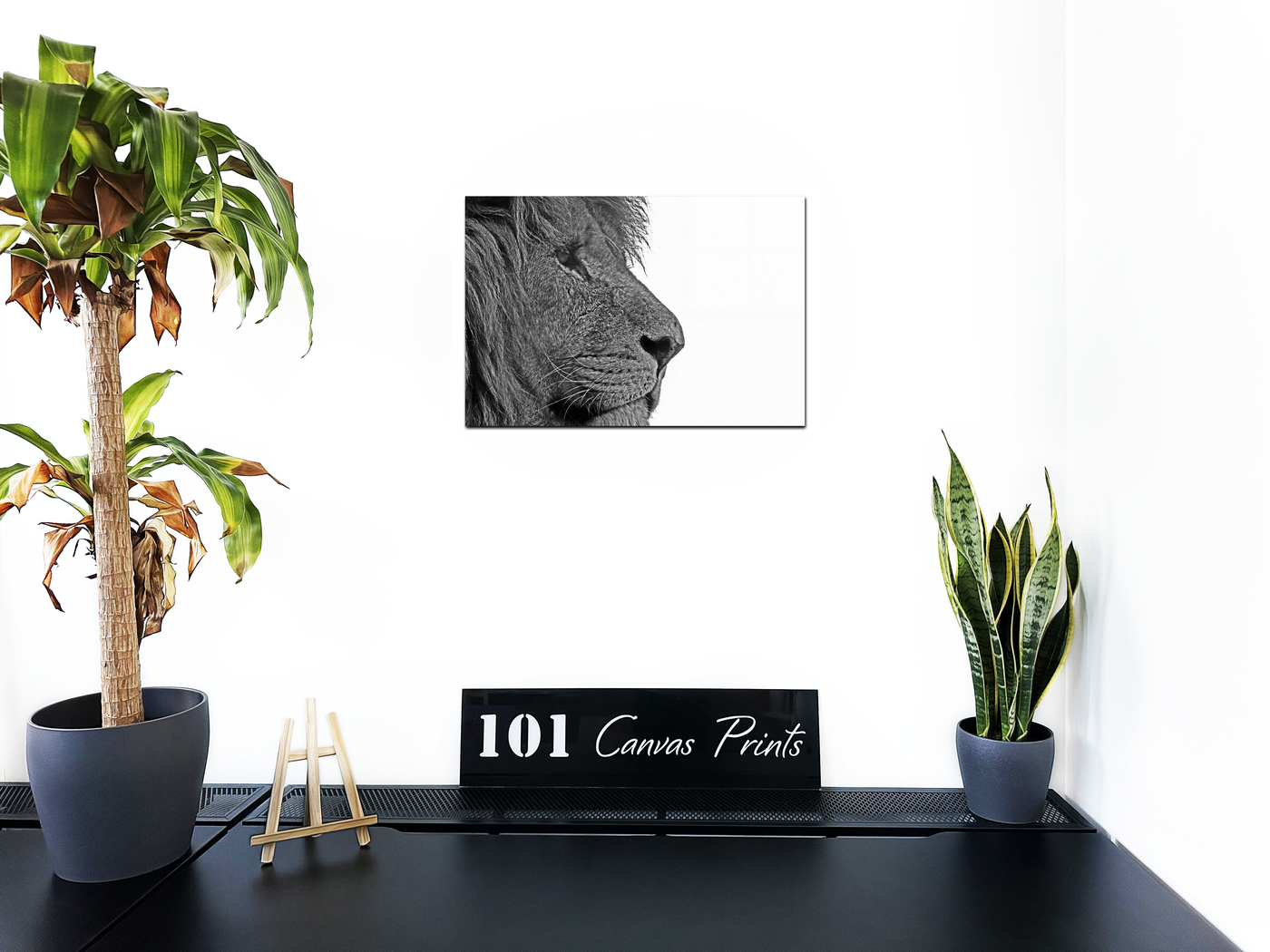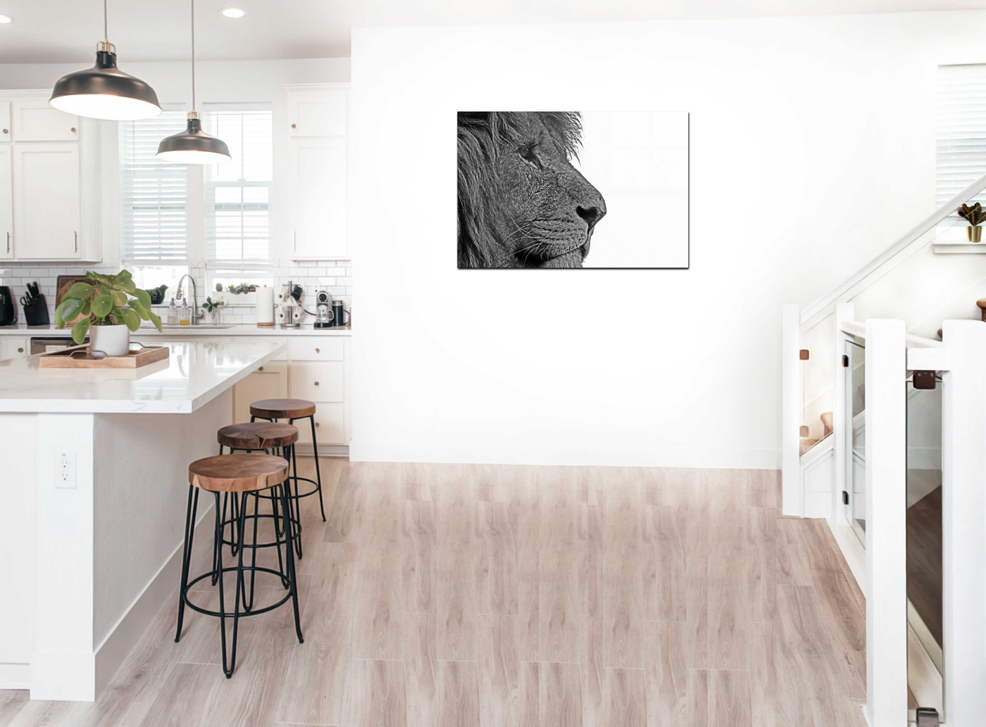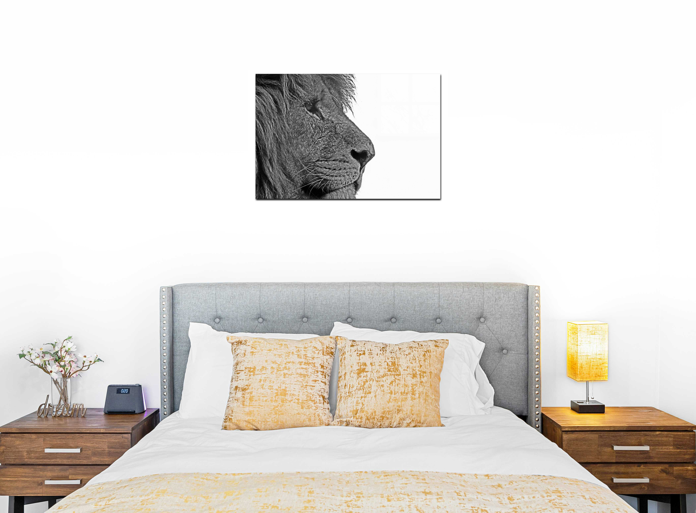 A majestic lion is a force to be reckoned with his stern, unblinking gaze that captures the pride and determination of the king of beasts. This Acrylic print is perfect for any décor. A high quality Acrylic print, the Lion in Side-Profile features a close up portrait of a lion with a calm, composed expression.