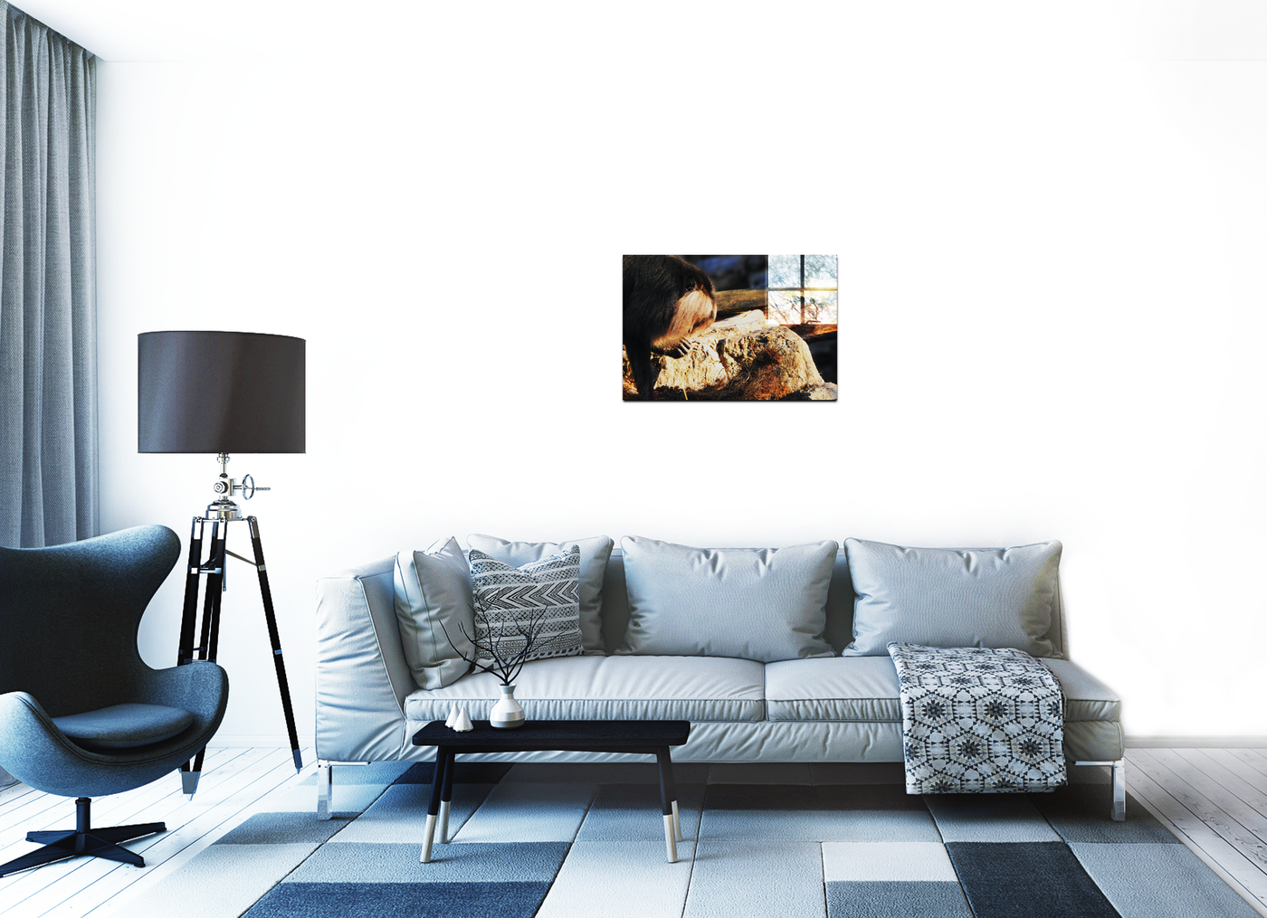 The striking beauty of the lion-tailed macaque has been captured in this Acrylic print. The photograph is printed on Acrylic with a warm palette of sandy tones and uses lighting and shadows to create an artistic impression.