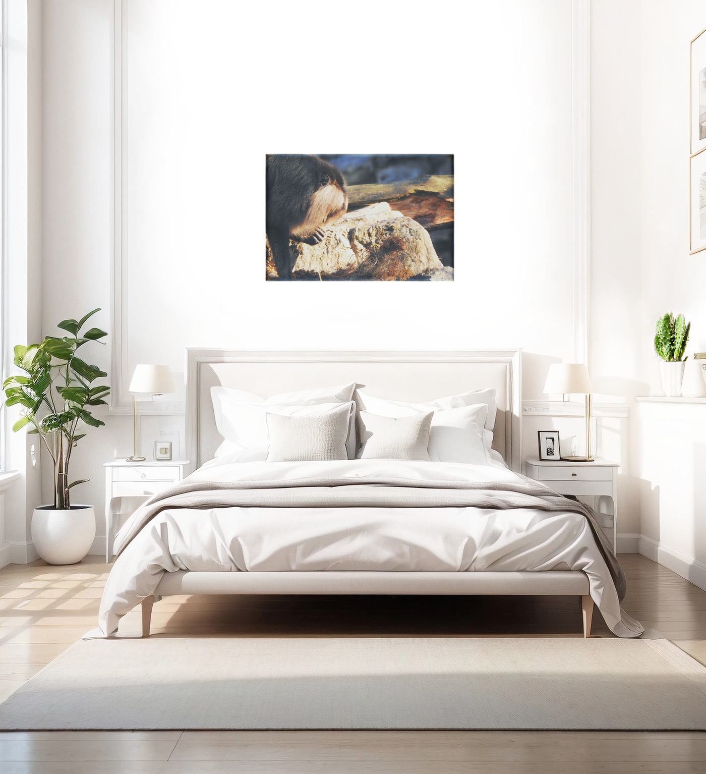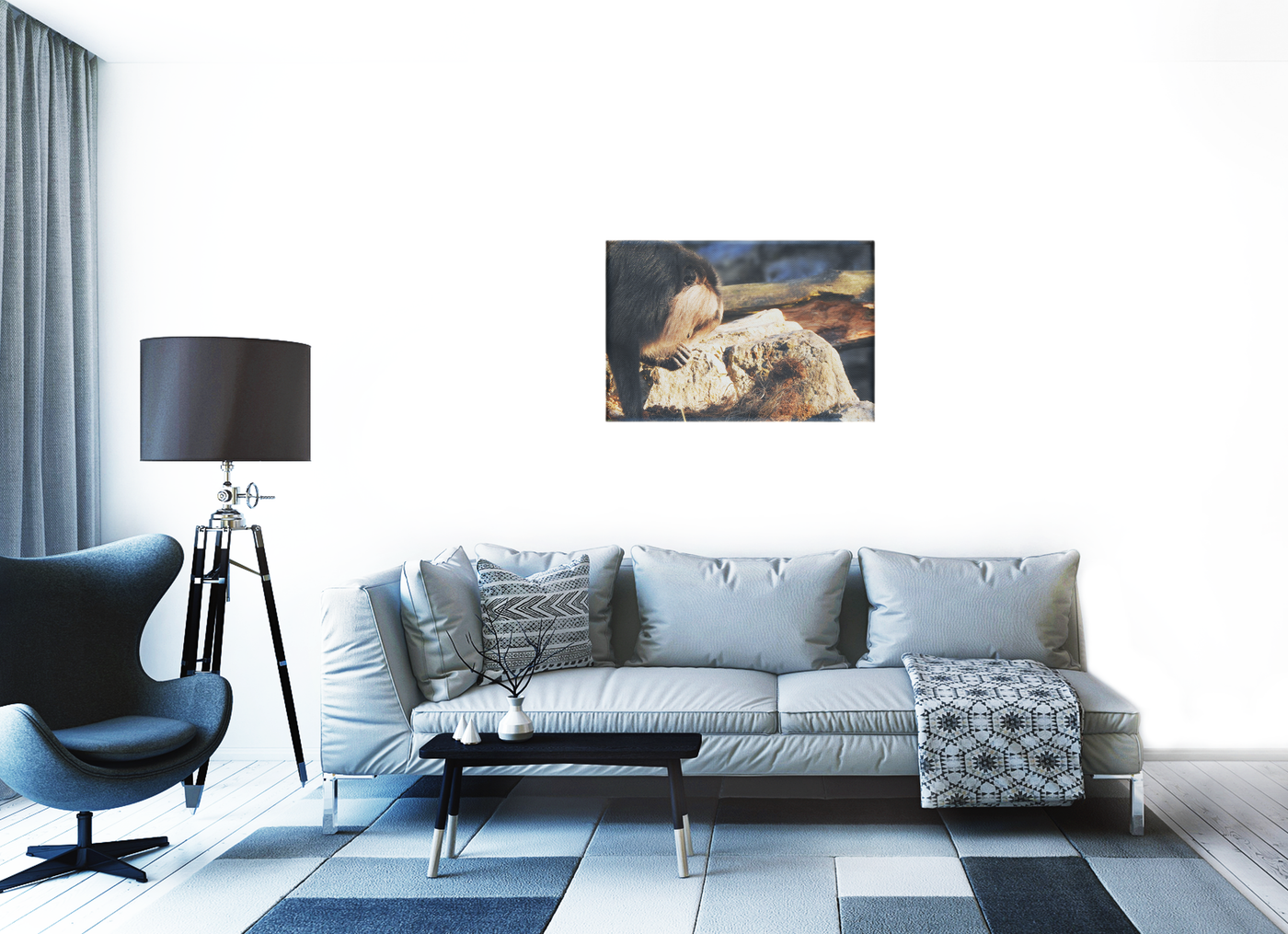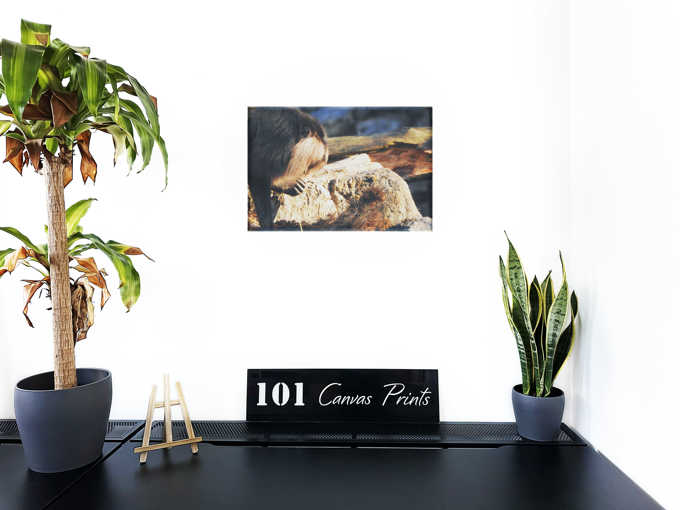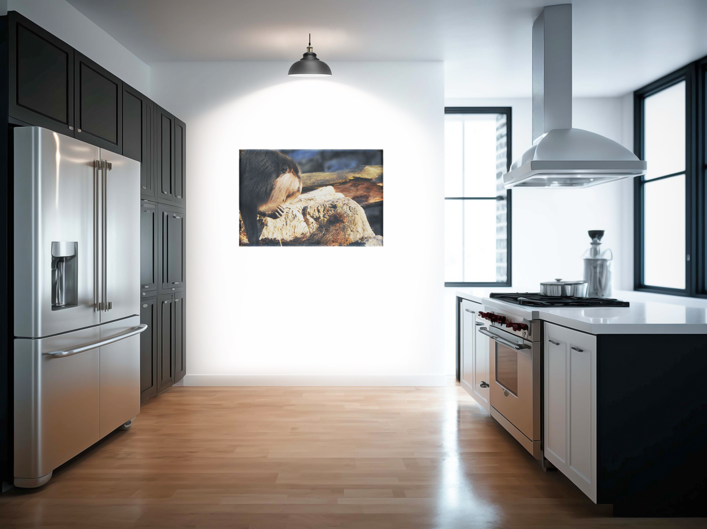 The striking beauty of the lion-tailed macaque has been captured in this Canvas print. The photograph is printed on Canvas with a warm palette of sandy tones and uses lighting and shadows to create an artistic impression.
