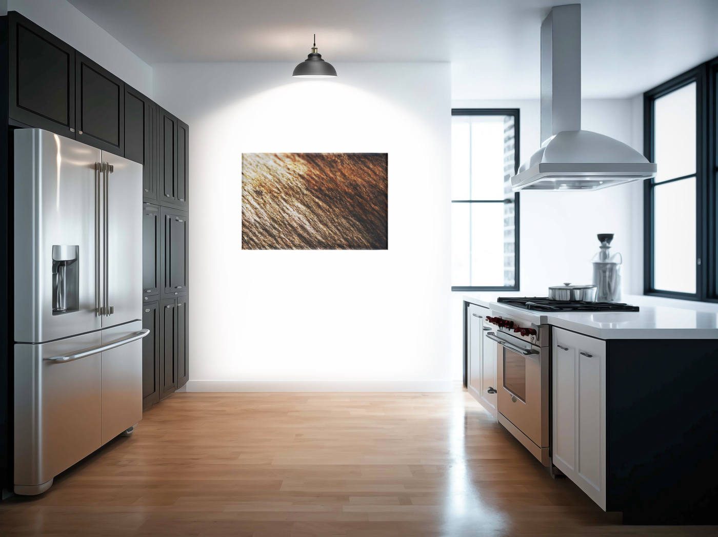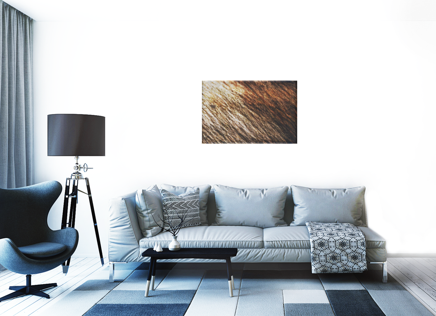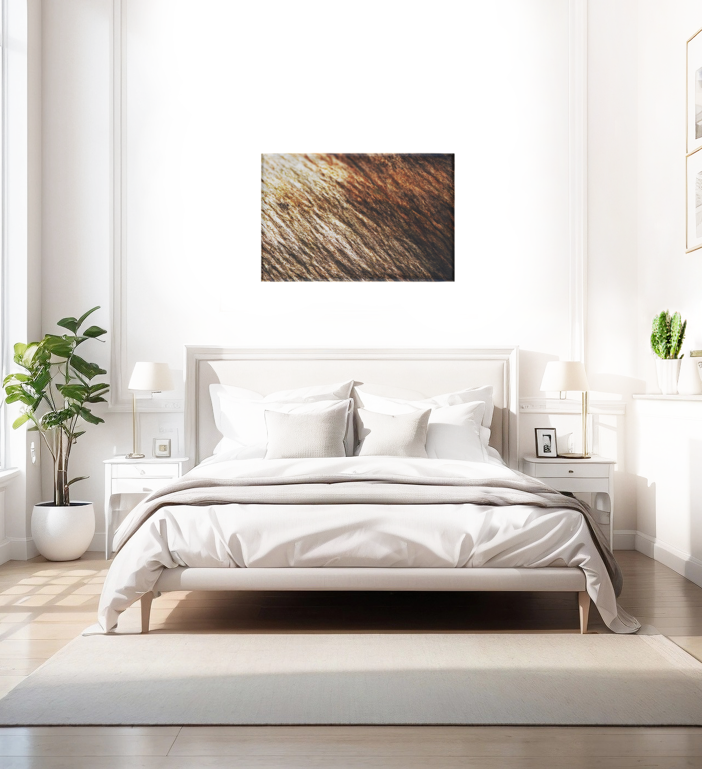 The natural texture of the Canvas beautifully complements the organic subject matter, enhancing the perceived roughness and depth of the rock's surface. The matte finish of the Canvas softens the contrasts slightly, creating a warm, inviting feel that draws the viewer in for a closer look. This print would be an excellent addition to a nature-inspired or contemporary interior, bringing a touch of geological beauty to any space. It could serve as a focal point in a living room, add a sense of timelessness to a study, or bring a grounding element to a modern, minimalist setting.