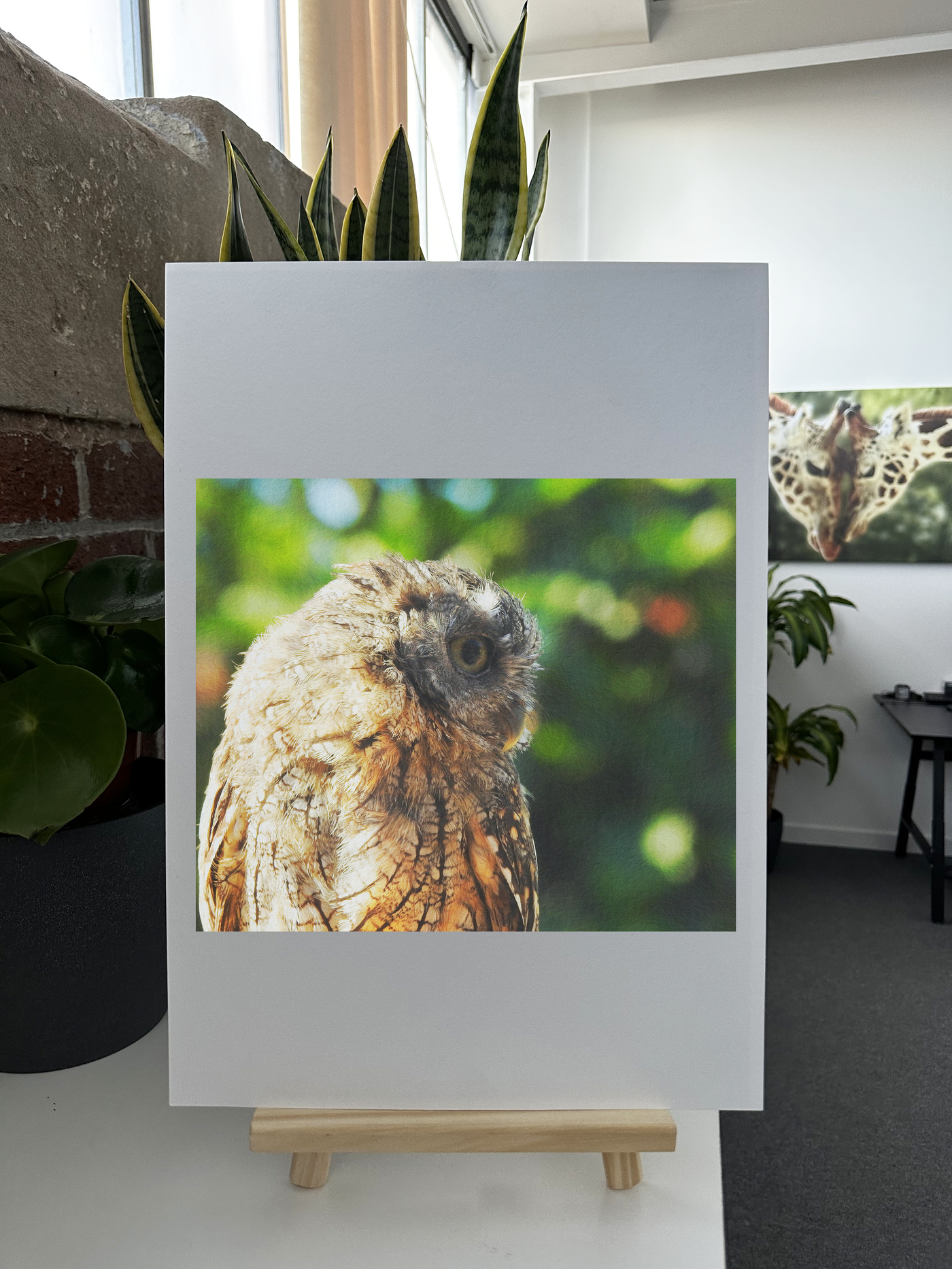 Showcasing a photograph of a beautiful little owl against a background of a leafy forest canopy, our Fine Art print is sure to bring serene style to your home. The neutral colours blend seamlessly with other pieces, while the natural colour palette and details enhance its timeless feel.