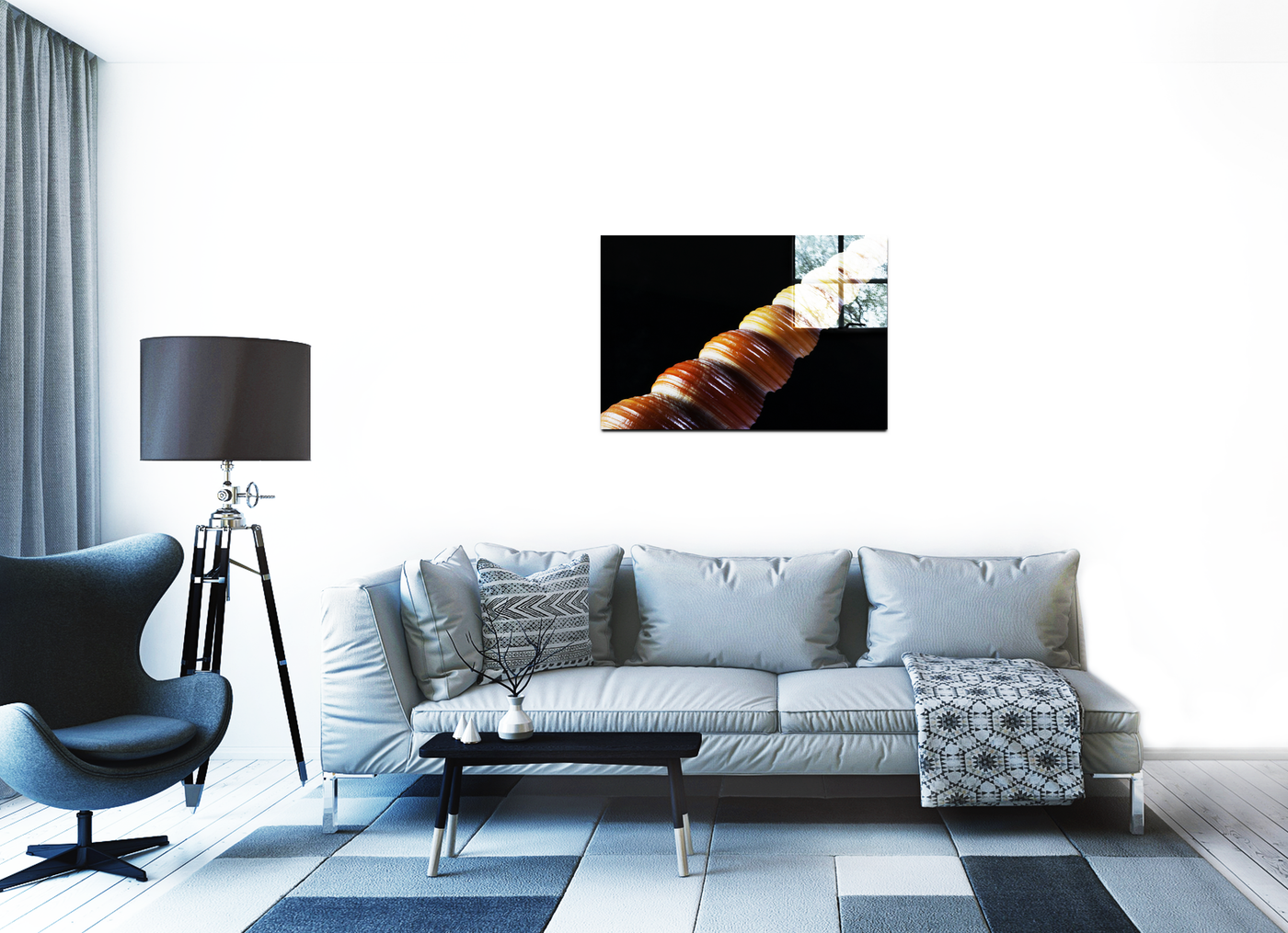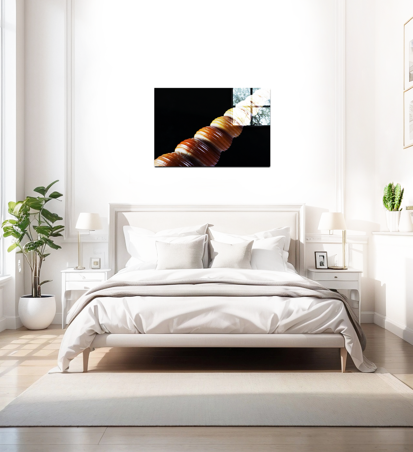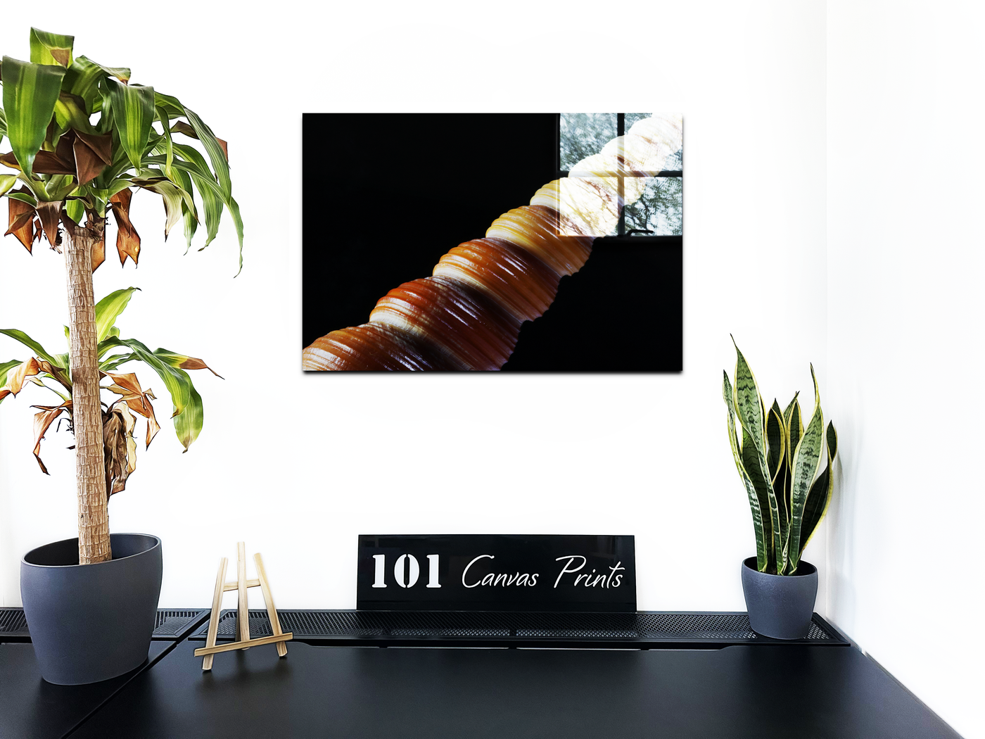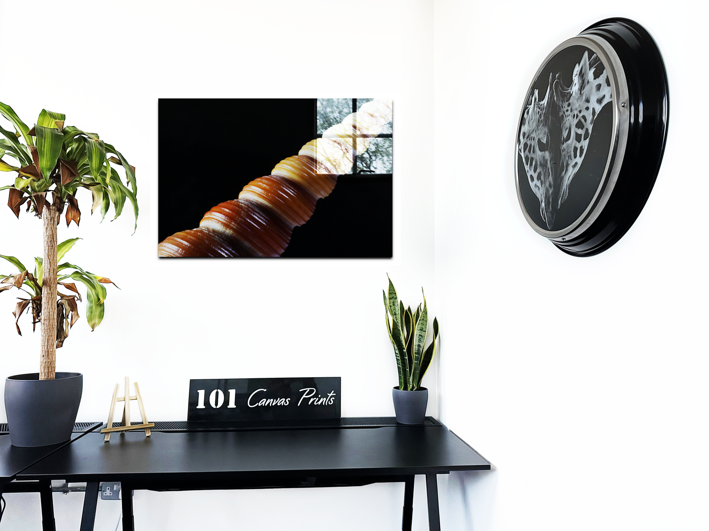 Angled on a dark background, the team have outdone themselves with this detailed Acrylic print. Notice how the position of the unicorn-like shell has showcased the depth of the mahogany, and its varying tawny to tan hues. The high-definition capture of the shell’s swirls shows a history of its growth and life.