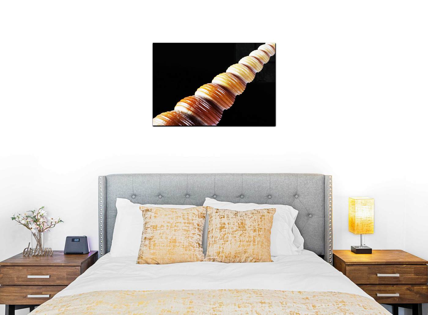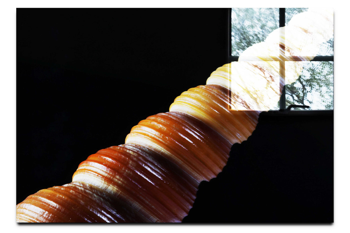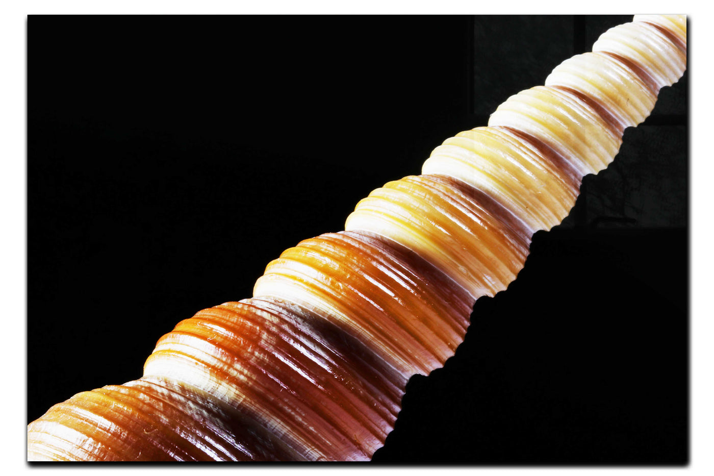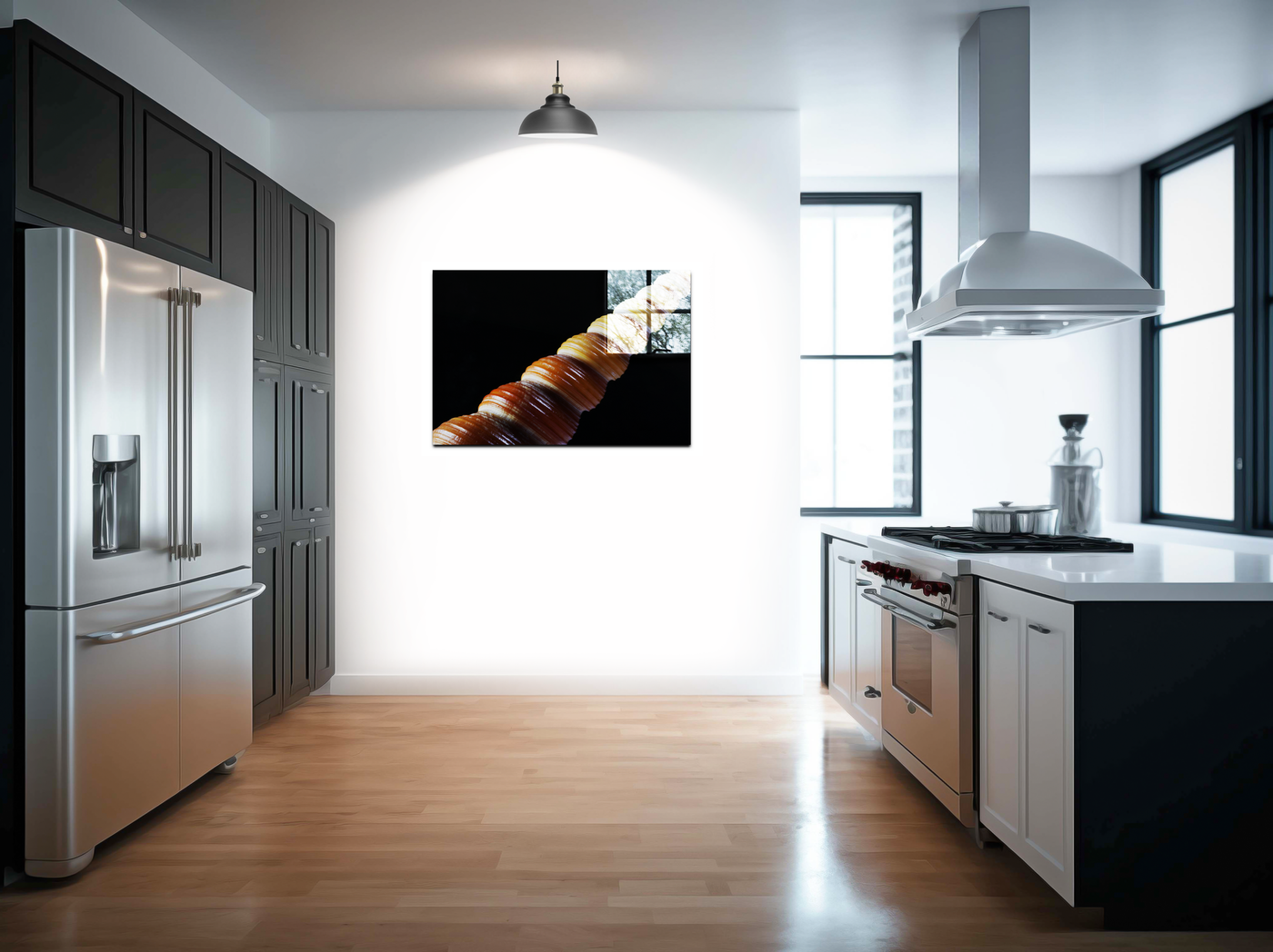 Angled on a dark background, the team have outdone themselves with this detailed Acrylic print. Notice how the position of the unicorn-like shell has showcased the depth of the mahogany, and its varying tawny to tan hues. The high-definition capture of the shell’s swirls shows a history of its growth and life.