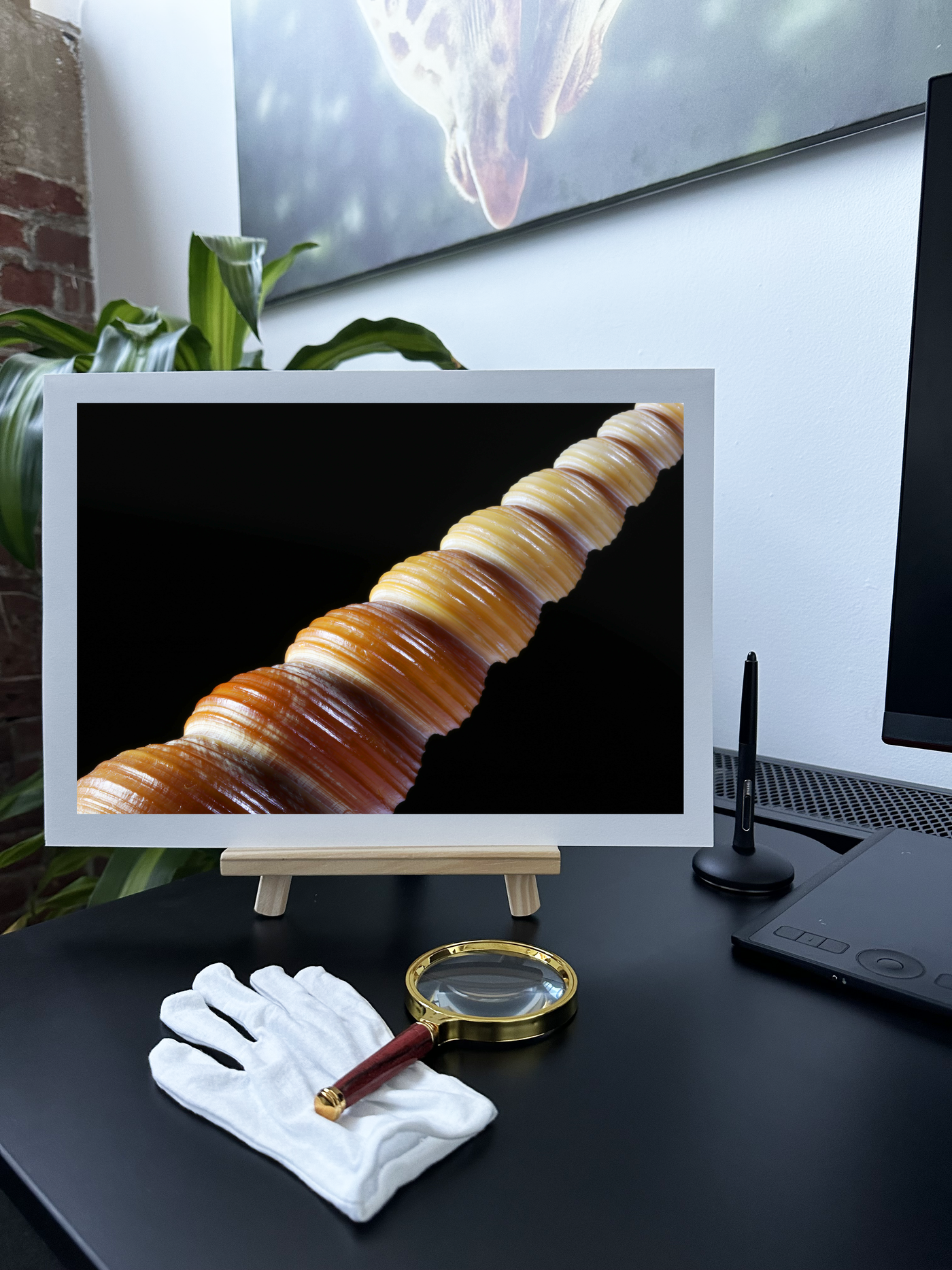 Angled on a dark background, the team have outdone themselves with this detailed Fine Art print. Notice how the position of the unicorn-like shell has showcased the depth of the mahogany, and its varying tawny to tan hues. The high-definition capture of the shell’s swirls shows a history of its growth and life.