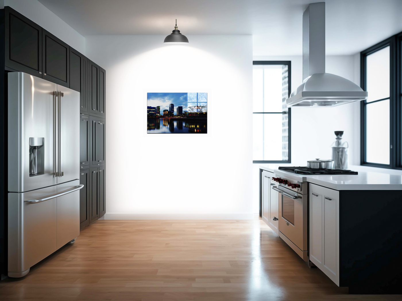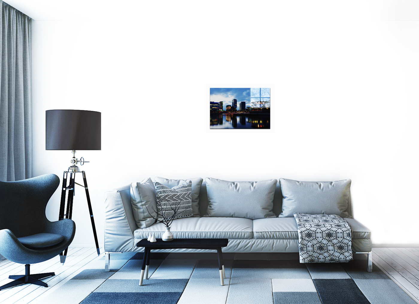 The acrylic-set print's high-gloss finish amplifies the vibrancy of the city lights and their reflections, creating an almost three-dimensional effect. It enhances the contrast between the cool water and warm building lights, making the scene appear even more dynamic and alive. 101 Canvas Prints' skilled photographers have produced a piece that shines in modern lobbies, upscale restaurants, or stylish home interiors. In these settings, the Acrylic print's crisp details and luminous quality invite viewers to appreciate the beauty of this contemporary urban landscape, showcasing Salford's evolution as a centre of media and technology.