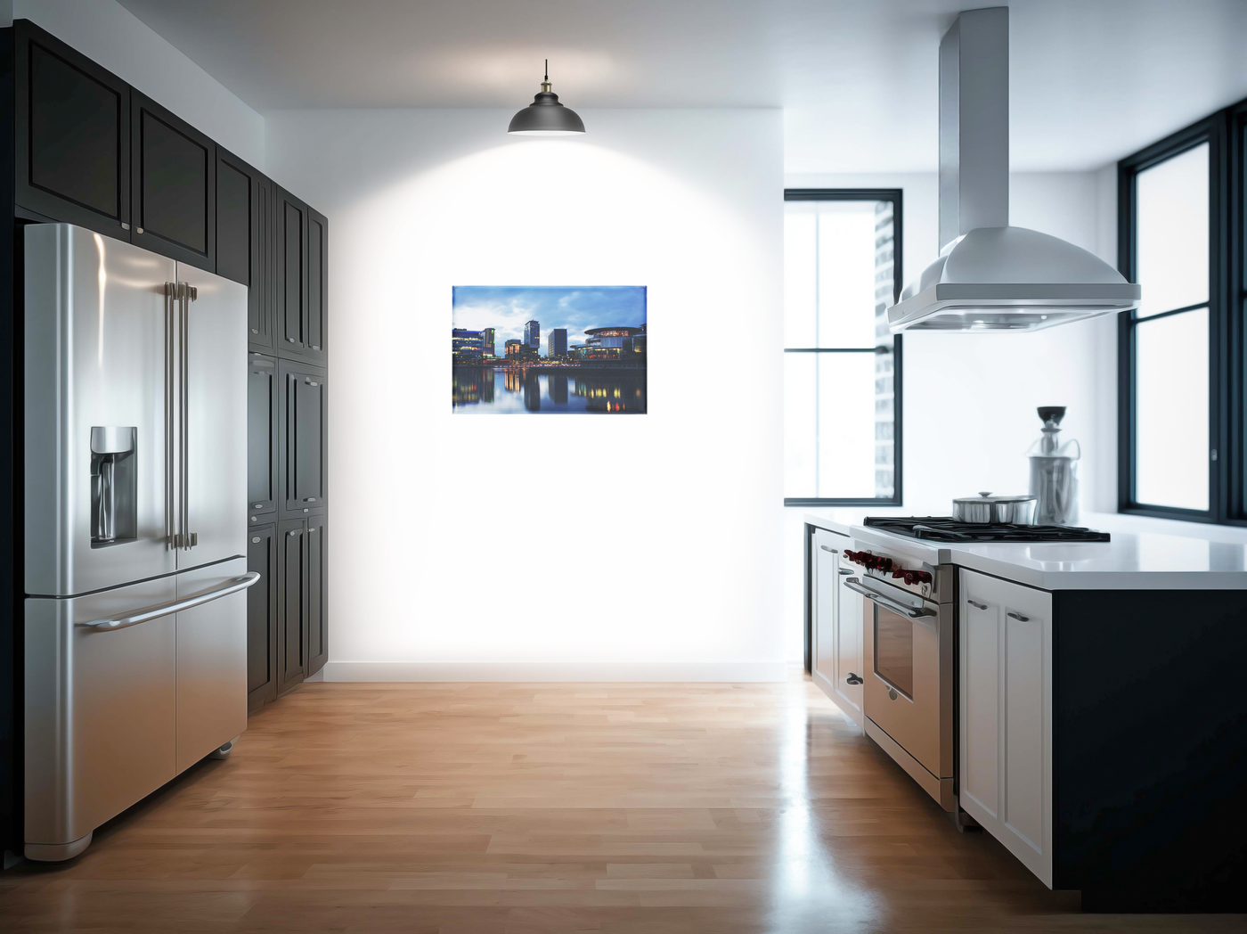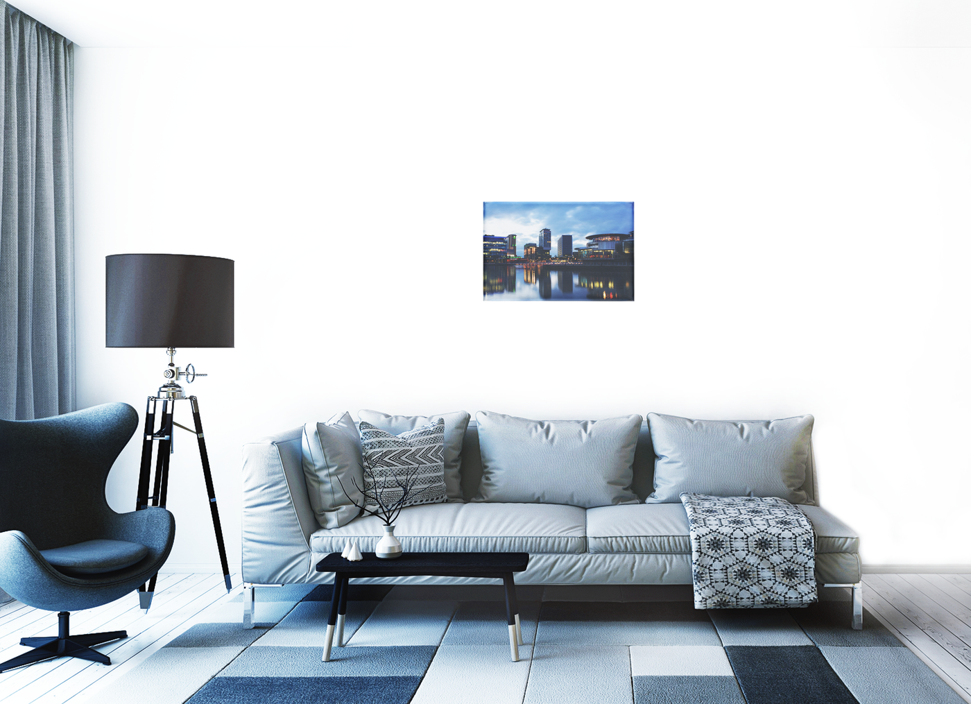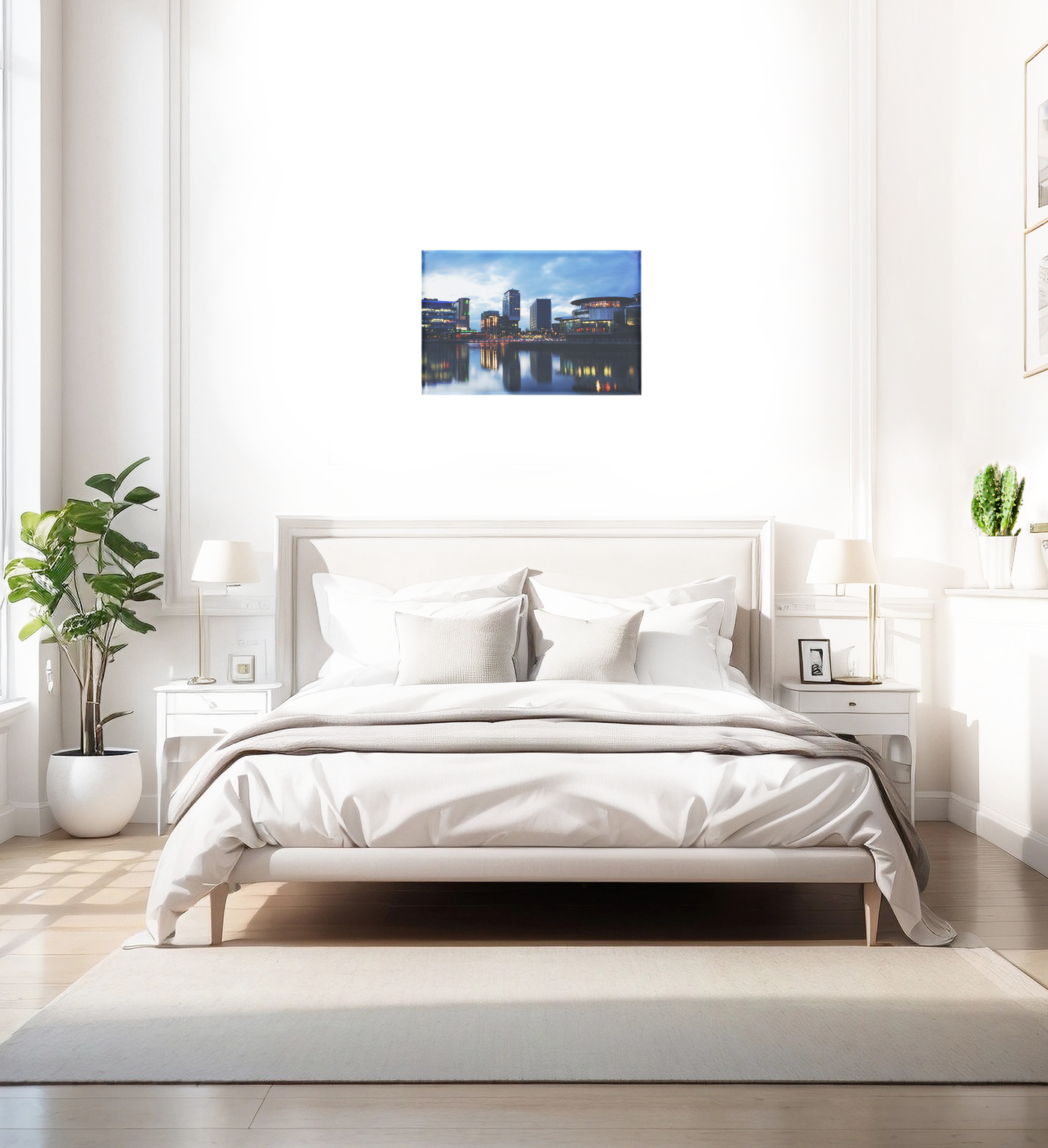 The Canvas print medium enhances the photograph's serene quality, its texture softening the urban edges and adding depth to the reflections in the water. The matte finish complements the twilight atmosphere, preserving the delicate balance of light and shadow. 101 Canvas Prints' photography team has captured Media City's essence, producing a piece that celebrates modern urban design and development. This Canvas Art print is ideal for corporate offices, contemporary living spaces, or any area where one wishes to introduce a touch of urban sophistication and calm.