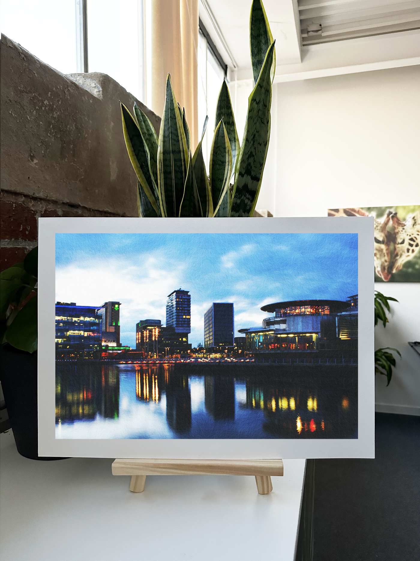 The Fine Art print medium enhances the photograph's serene quality, its texture softening the urban edges and adding depth to the reflections in the water. The matte finish complements the twilight atmosphere, preserving the delicate balance of light and shadow. 101 Canvas Prints' photography team has captured Media City's essence, producing a piece that celebrates modern urban design and development. This Fine Art print is ideal for corporate offices, contemporary living spaces, or any area where one wishes to introduce a touch of urban sophistication and calm.