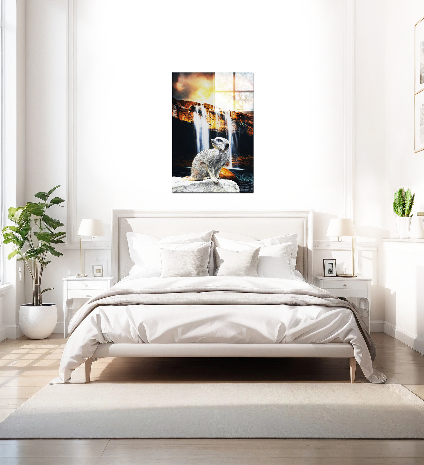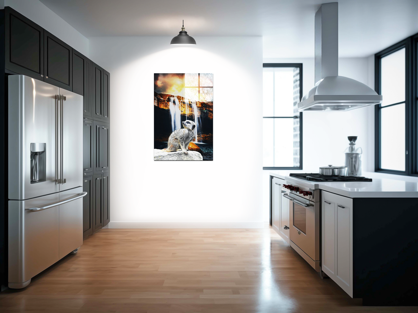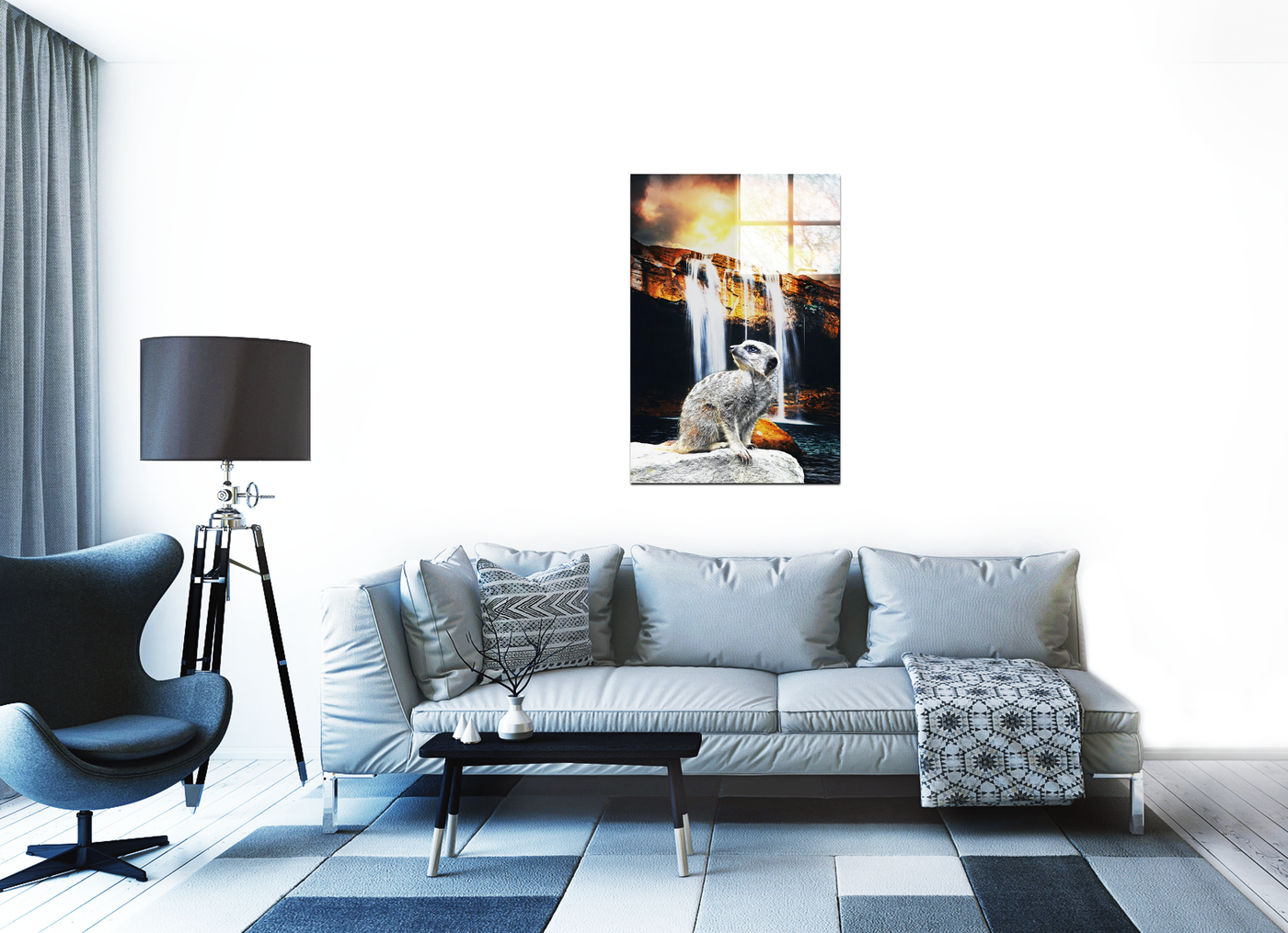 Our Waterfall Meerkat Acrylic print is the perfect way to bring nature into your home. The detail in the image contrasts with the abstracted background to create a balanced, cool canvas print.