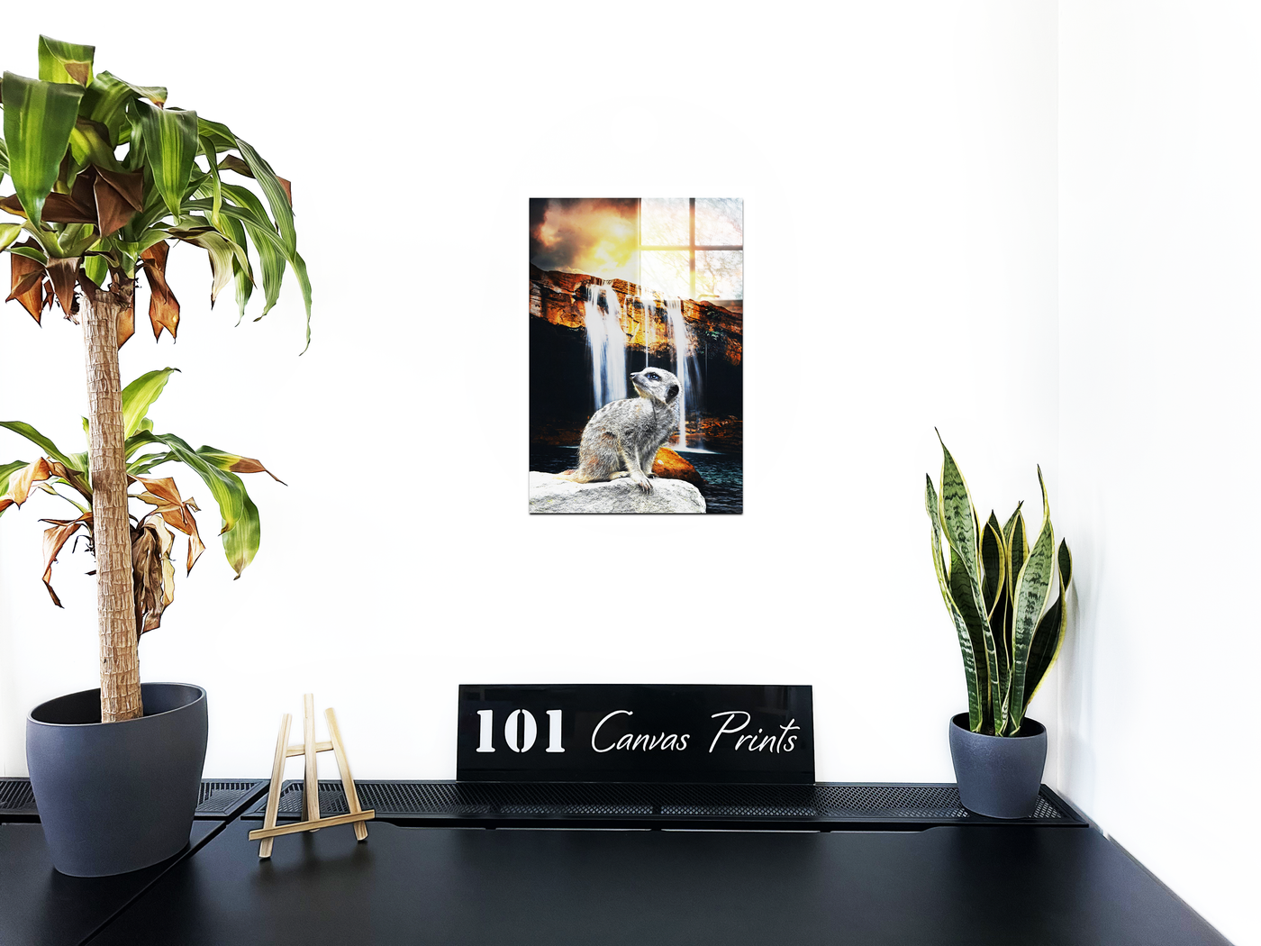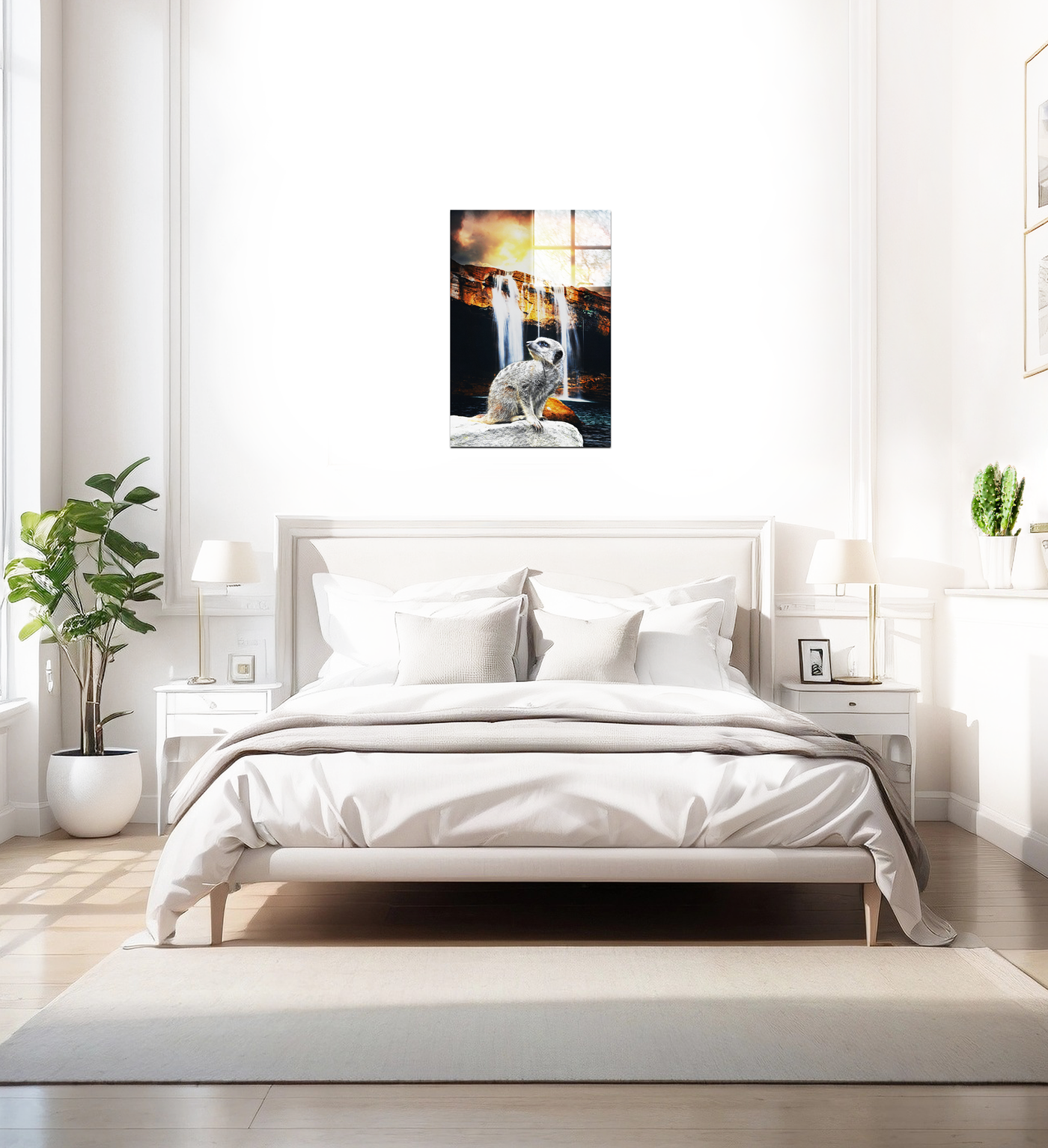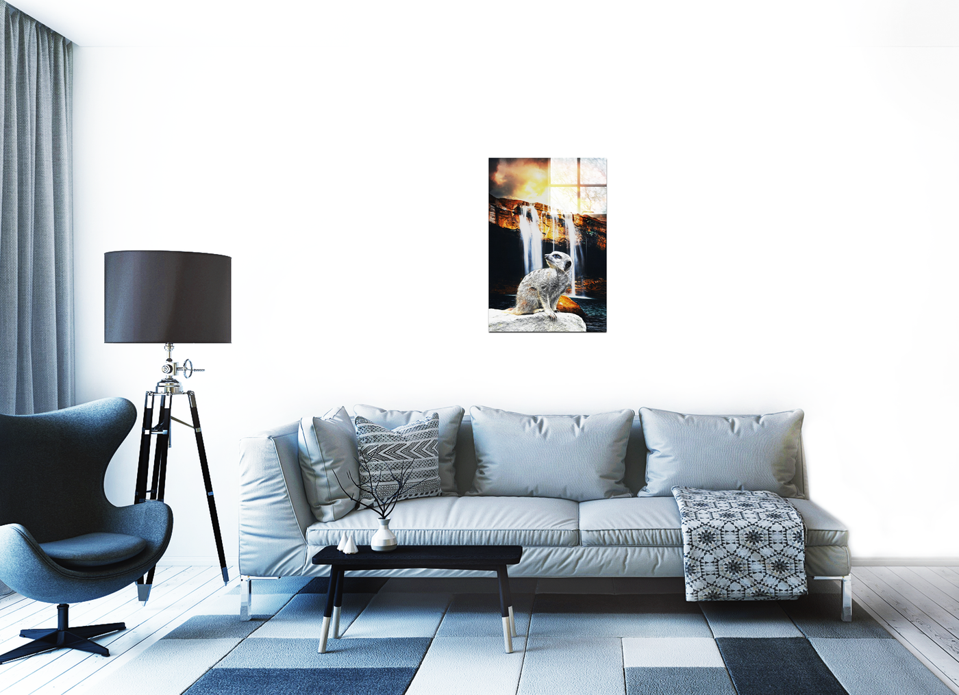Our Waterfall Meerkat Acrylic print is the perfect way to bring nature into your home. The detail in the image contrasts with the abstracted background to create a balanced, cool canvas print.