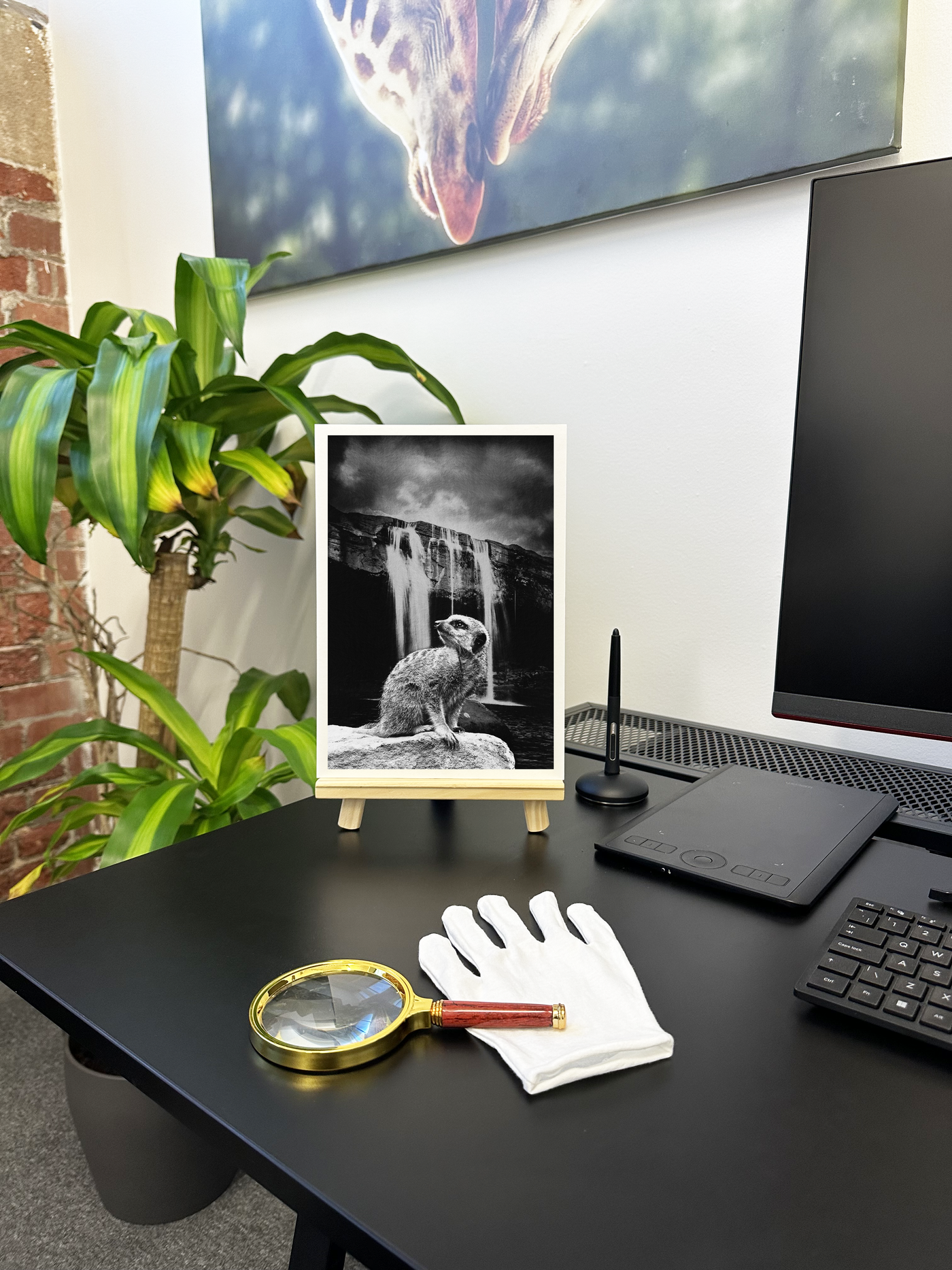Our Waterfall Monochrome Meerkat Fine Art print is the perfect way to bring nature into your home. The detail in the image contrasts with the abstracted background to create a balanced, cool Monochrome Fine Art print.