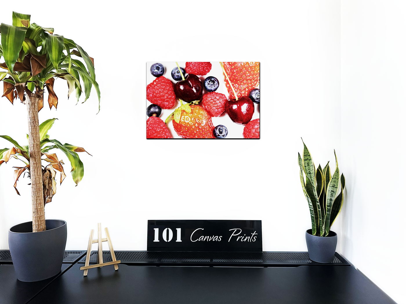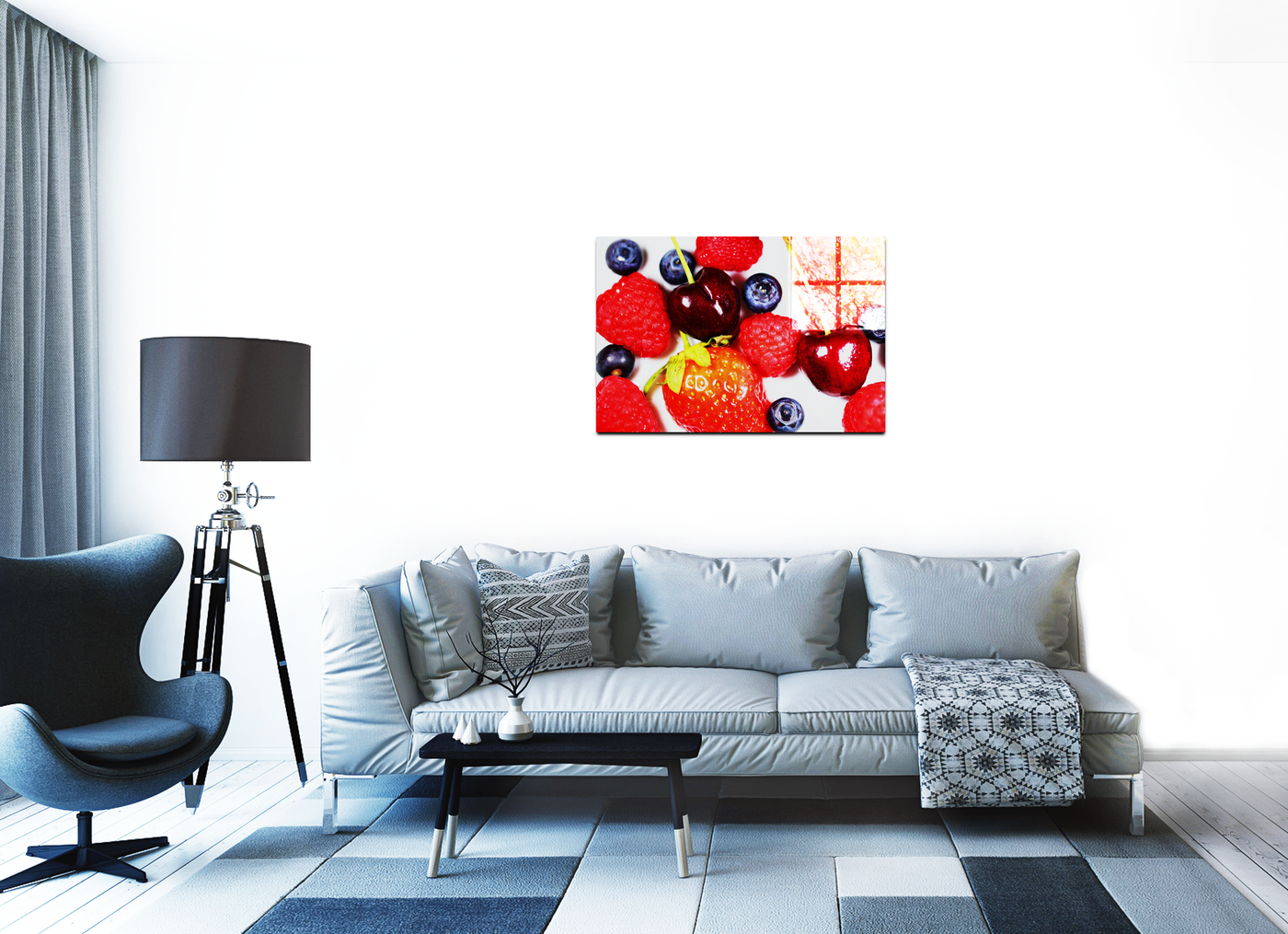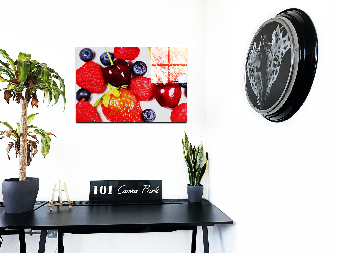 This stunning image from the 101 Canvas Prints collection transforms a simple arrangement of berries into a vivid work of art. The photograph presents a cornucopia of fresh berries - plump strawberries, delicate raspberries, juicy cherries, and ripe blueberries - composed in an appealing, seemingly random scatter that invites the viewer to reach out and sample the fruits.