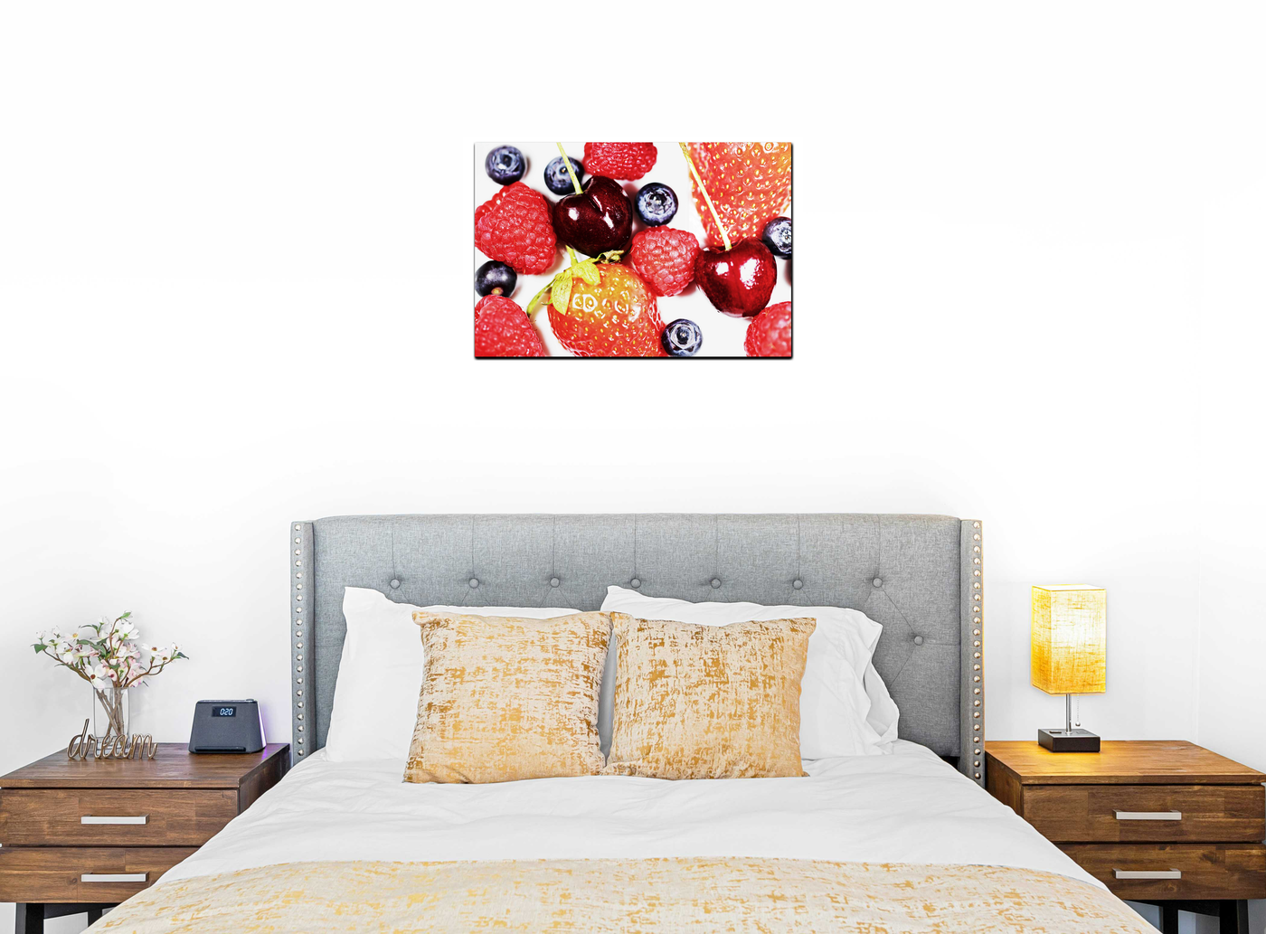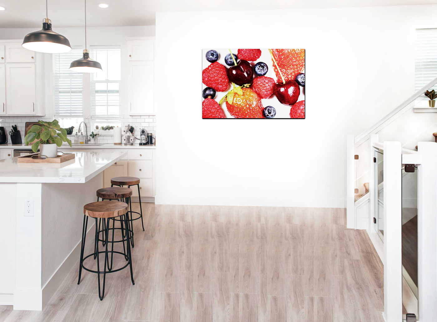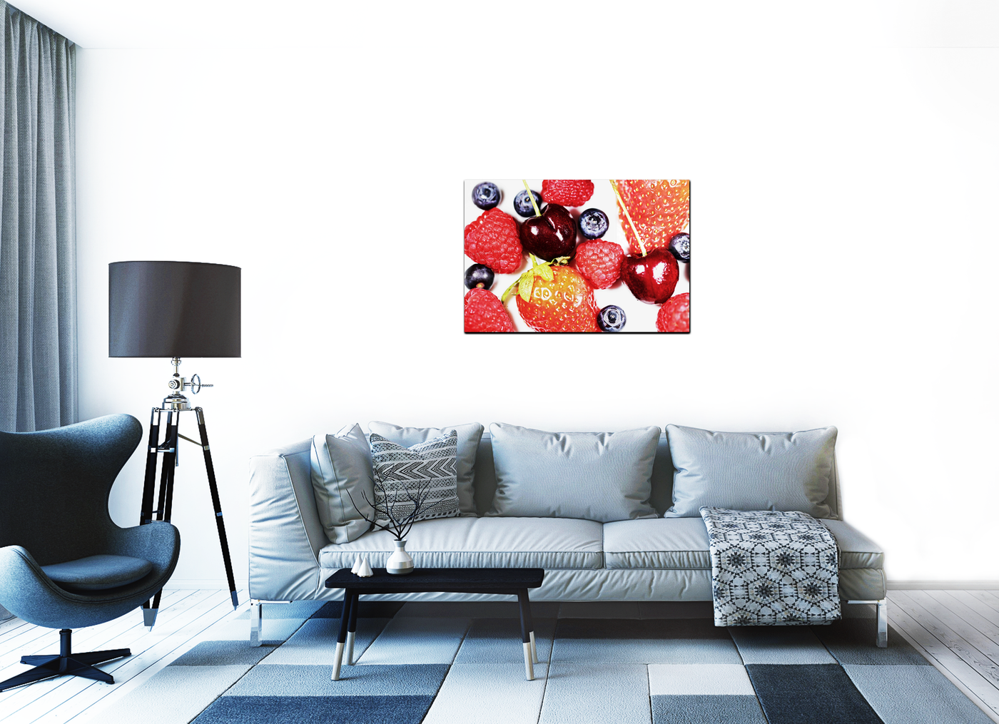 This stunning image from the 101 Canvas Prints collection transforms a simple arrangement of berries into a vivid work of art. The photograph presents a cornucopia of fresh berries - plump strawberries, delicate raspberries, juicy cherries, and ripe blueberries - composed in an appealing, seemingly random scatter that invites the viewer to reach out and sample the fruits.