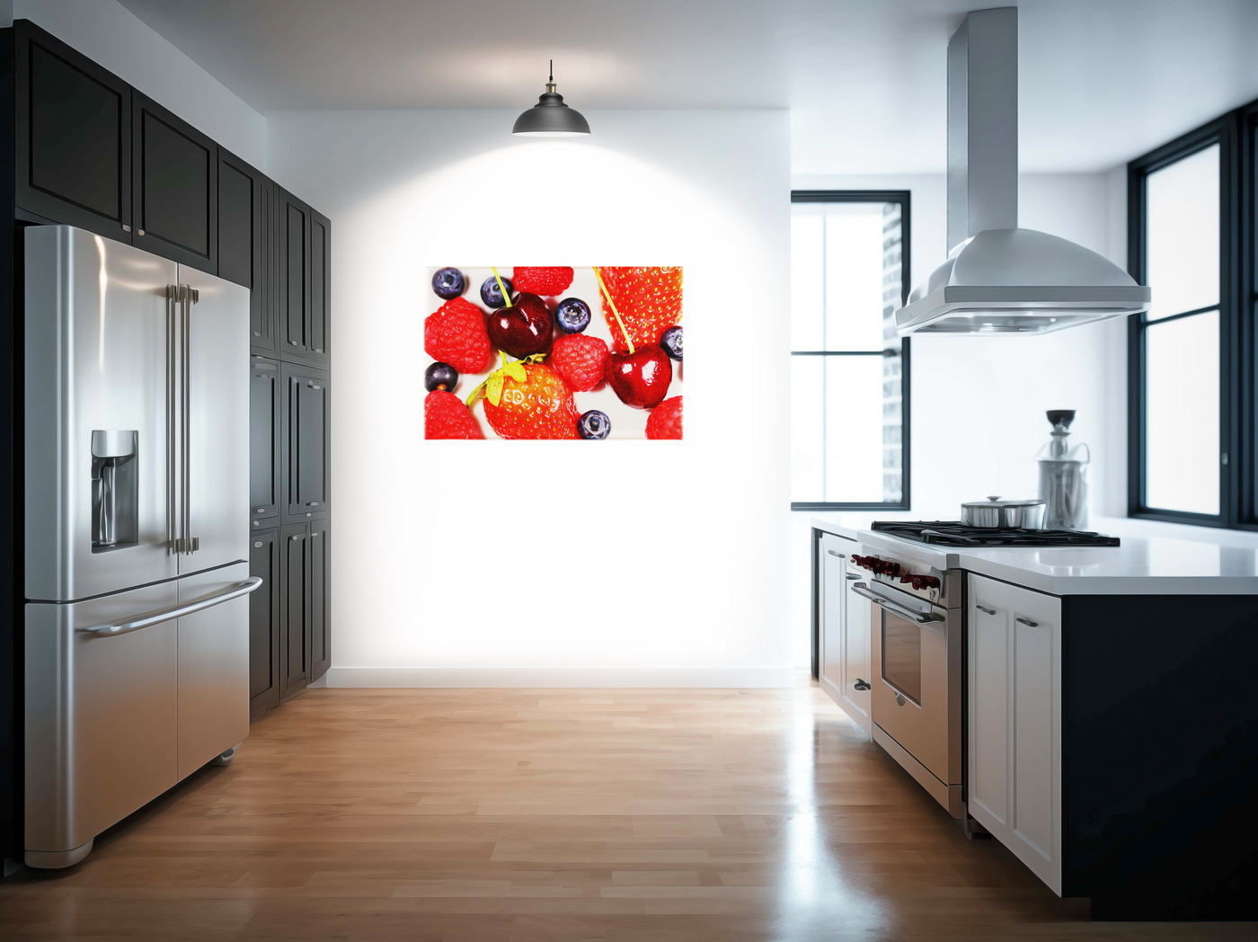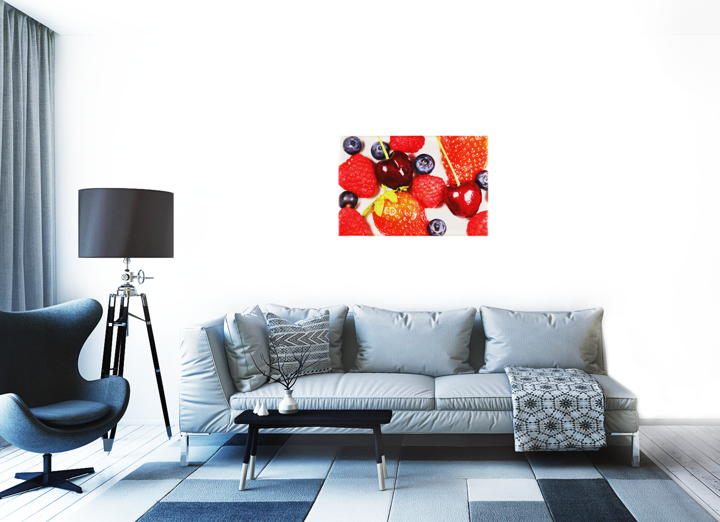 This vibrant photograph from the 101 Canvas Prints photography team showcases a tantalising array of fresh berries. The composition features a delightful mix of strawberries, raspberries, blueberries, and cherries, artfully arranged against a clean, light background. Each fruit is captured in stunning detail, highlighting the unique textures and shapes that make berries so visually appealing.