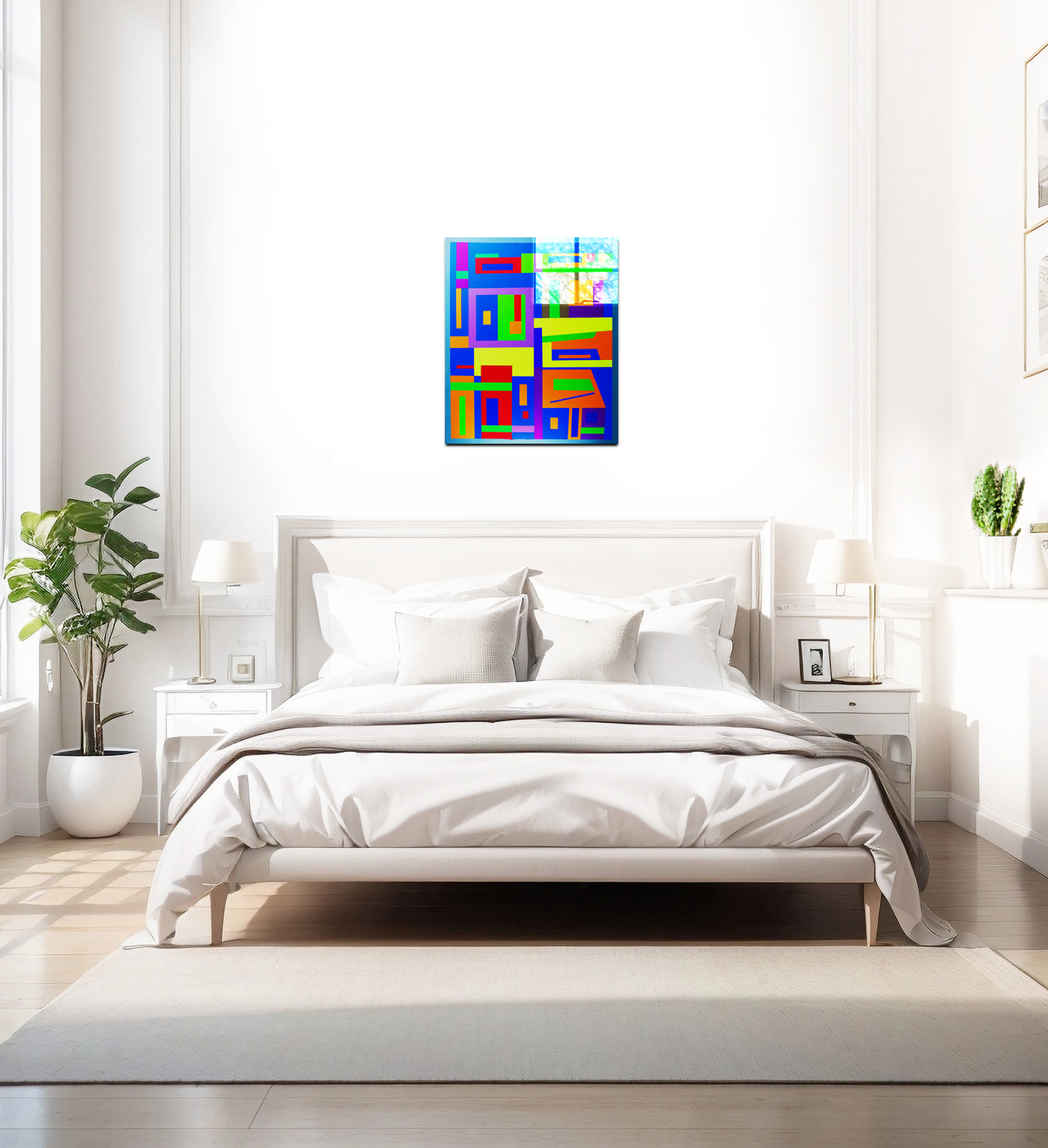 The artist's sophisticated use of colour creates a powerful visual impact, with each hue carefully chosen and positioned to create balance and movement throughout the composition. Through our precise photography and print enhancement process, we've maintained the crisp edges between colour fields while preserving the subtle variations that give each section its distinct character. The result is an image that serves both as a personal memoir and a striking example of geometric abstraction.