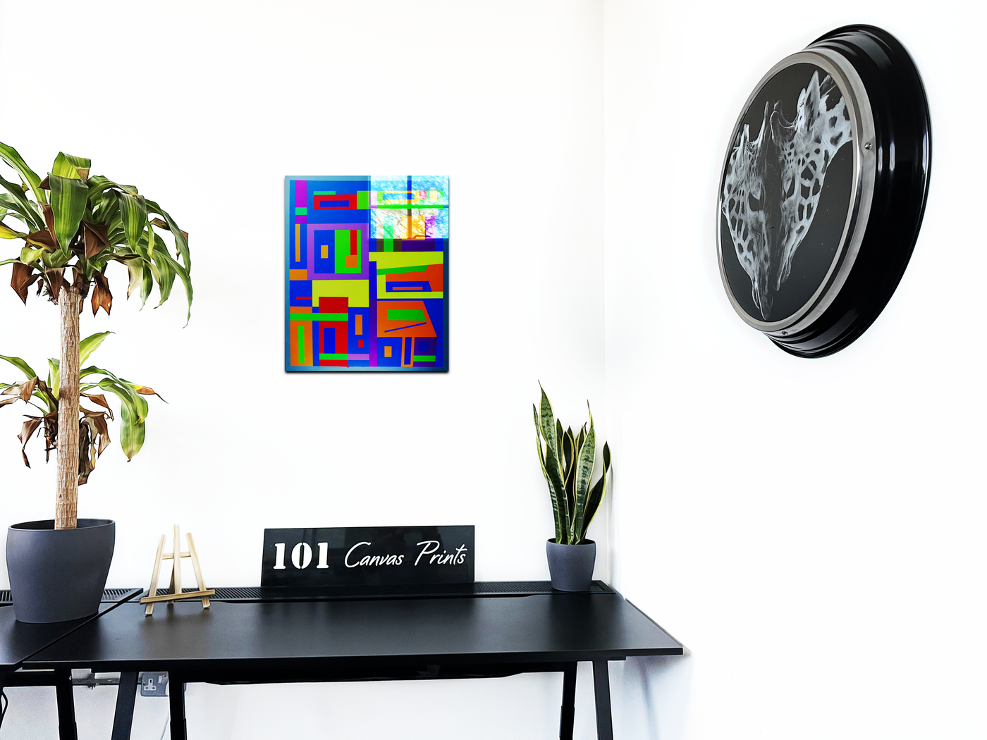 "Modern Village," expertly reproduced by the 101 Canvas Prints team, presents a boldly geometric abstraction of the artist's hometown, filtered through the influence of Reinhardt's modernist sensibilities. The composition transforms personal geography into a precise arrangement of colour blocks and linear forms, creating a dynamic visual representation of community and memory. Each geometric shape seems to represent a different aspect of village life, arranged in a harmonious grid that suggests both organisation and vitality.