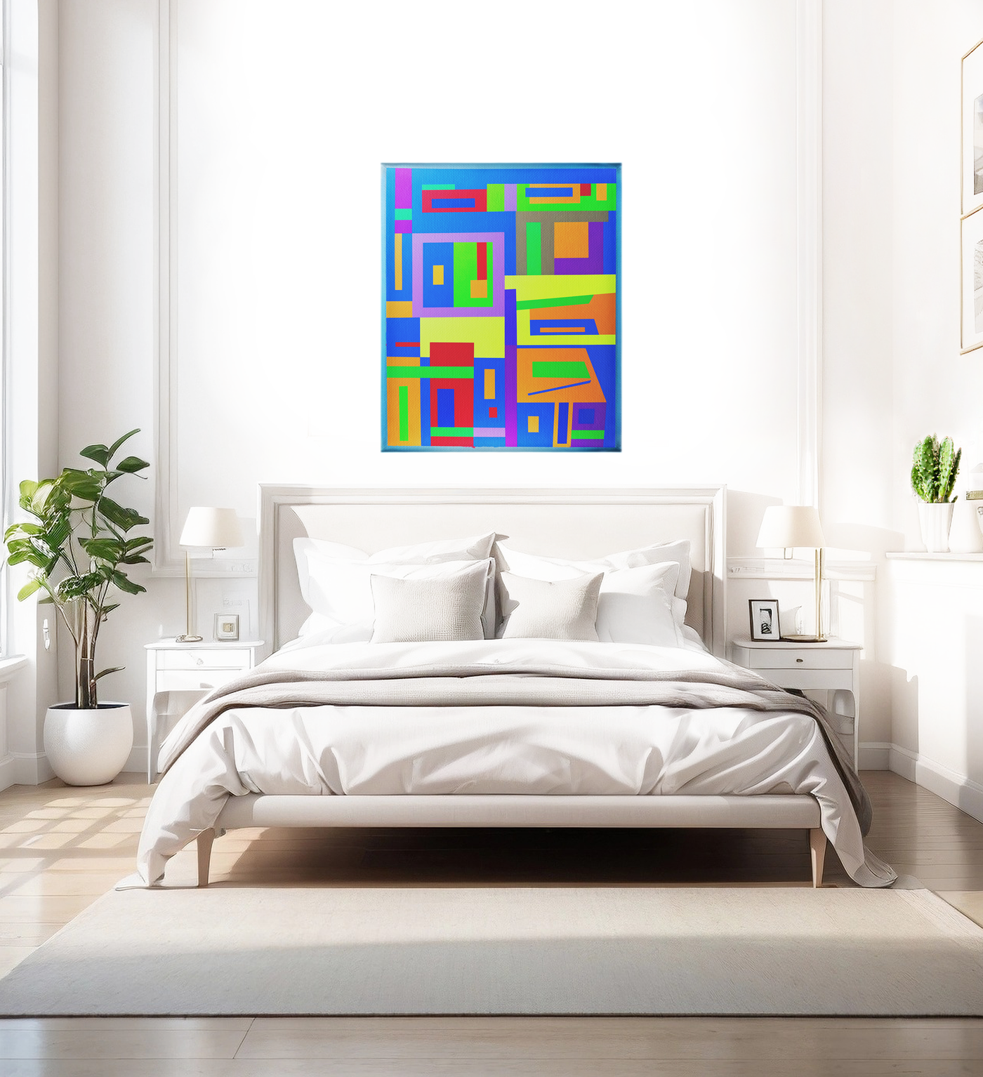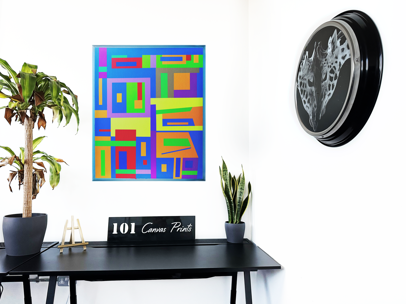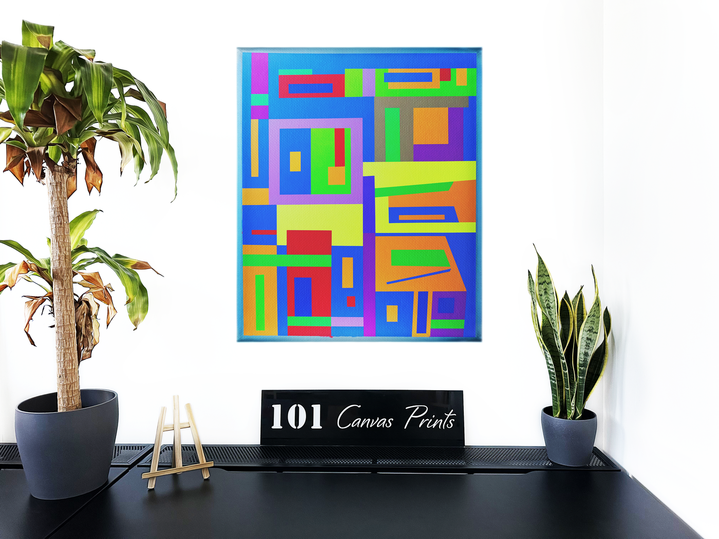 Masterfully captured by the 101 Canvas Prints photography team, "Modern Village" presents a deeply personal interpretation of place through geometric abstraction. Inspired by Reinhardt's precise approach to composition, the artist has transformed memories of their hometown into a vibrant grid of intersecting shapes and colours. The painting creates an architectural rhythm through carefully balanced rectangles and squares, suggesting buildings, streets, and the organised chaos of village life viewed from above.