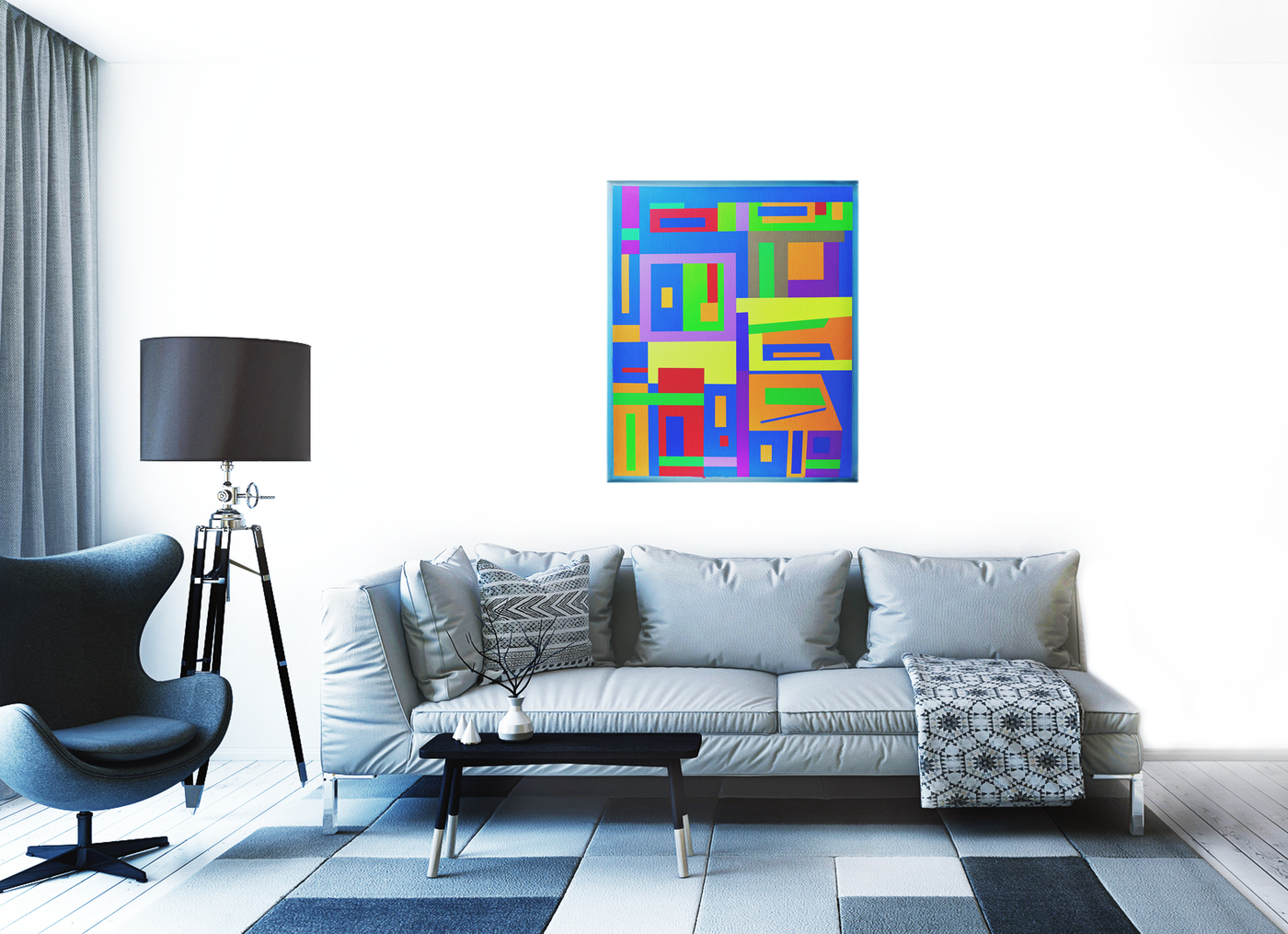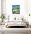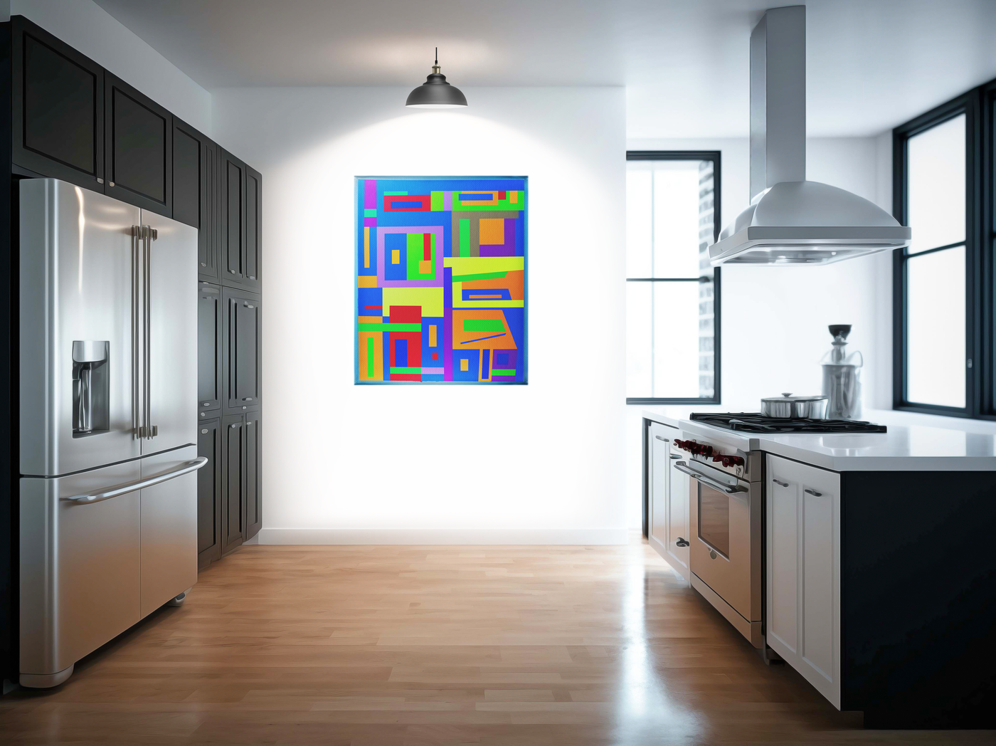 The colour palette is bold and contemporary, combining deep cobalt blues with vibrant lime greens, warm oranges, and striking purples. Each colour block appears to represent different aspects of community life, creating a map-like quality that speaks to both memory and modernism. Our print enhancement team have preserved the precise edges between each geometric form while maintaining the subtle variations in tone that give the piece its depth and complexity.