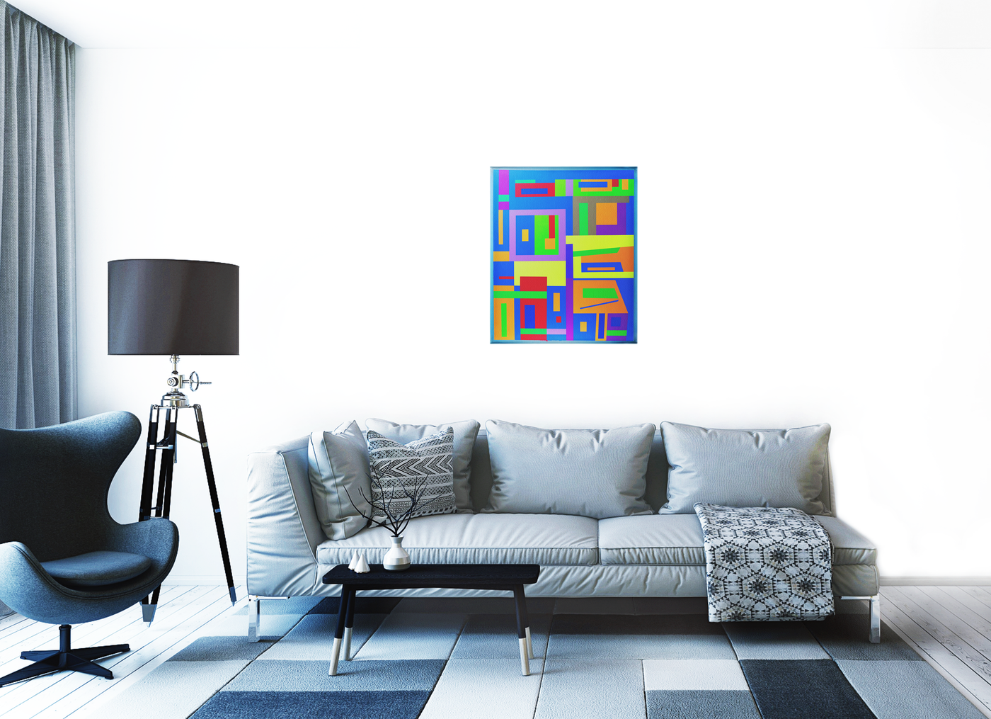 The colour palette is bold and contemporary, combining deep cobalt blues with vibrant lime greens, warm oranges, and striking purples. Each colour block appears to represent different aspects of community life, creating a map-like quality that speaks to both memory and modernism. Our print enhancement team have preserved the precise edges between each geometric form while maintaining the subtle variations in tone that give the piece its depth and complexity.