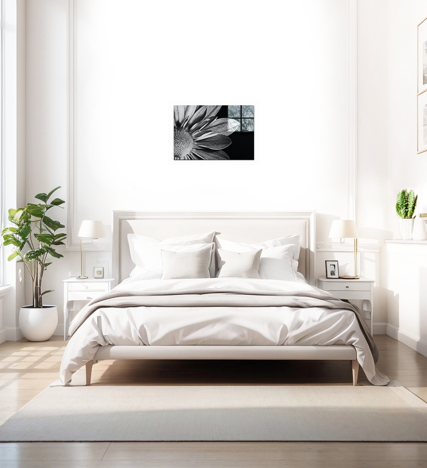 The Monochromatic palette allows for an extraordinary exploration of texture and tone, from the almost crystalline structure of the flower's centre to the smooth, luminous quality of the petals. Through our precise photography and print enhancement process, we've maintained every subtle gradation of grey, ensuring that the full range of tones is preserved with perfect clarity. The result is a study in contrast that reveals the extraordinary complexity present in everyday natural forms.