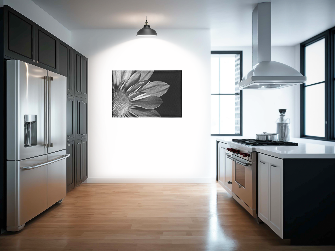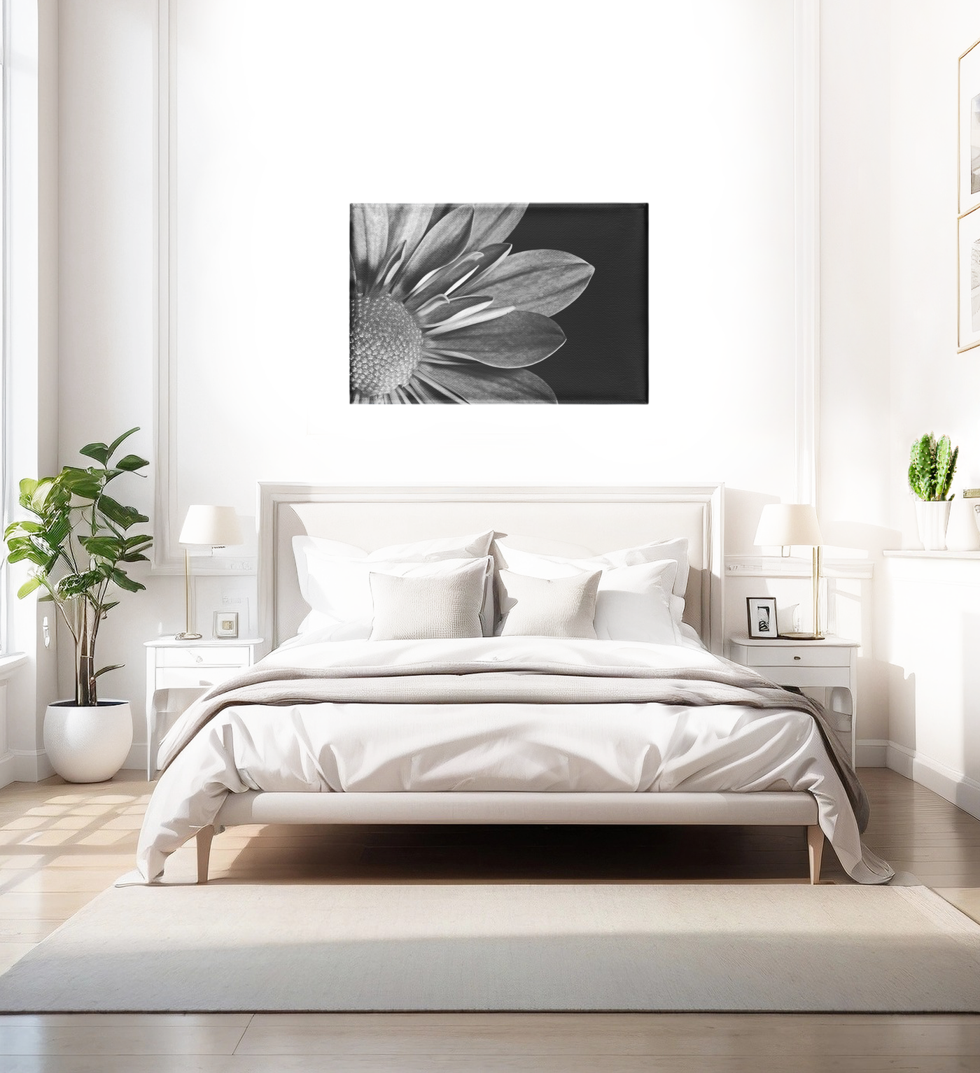 The Monochromatic treatment reveals every nuance of light and shadow, from the delicate venation in each petal to the mesmerising pattern of the flower's centre. Our print enhancement team have carefully balanced the contrast to preserve both the brightest highlights and the deepest shadows, ensuring that every detail is rendered with crystalline clarity. The textures are particularly striking - from the almost lunar surface of the central disc to the smooth, graceful curves of the petals.