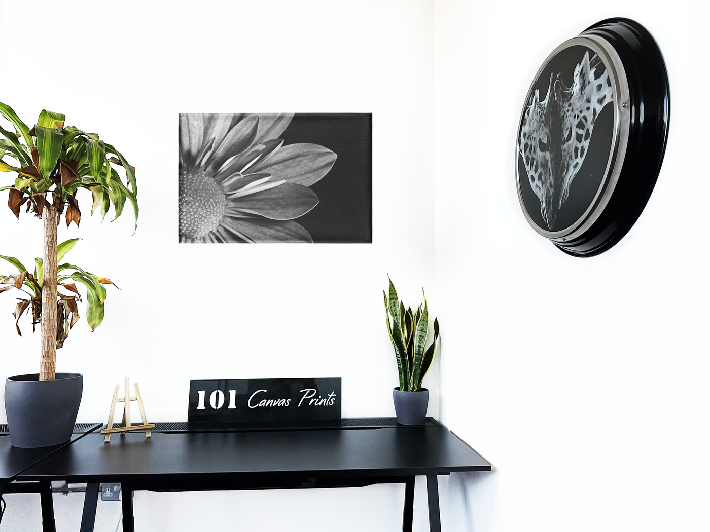 Masterfully captured by the 101 Canvas Prints photography team, this striking black and white photograph presents an intimate portrait of a daisy in dramatic detail. The composition focuses on a segment of the flower, with its perfectly formed petals radiating from the intricately textured centre. The close-up perspective transforms this simple flower into an architectural study of natural form, while subtle Monochromatic tones add an unexpected layer of depth and context.