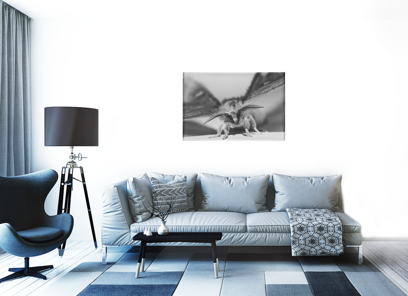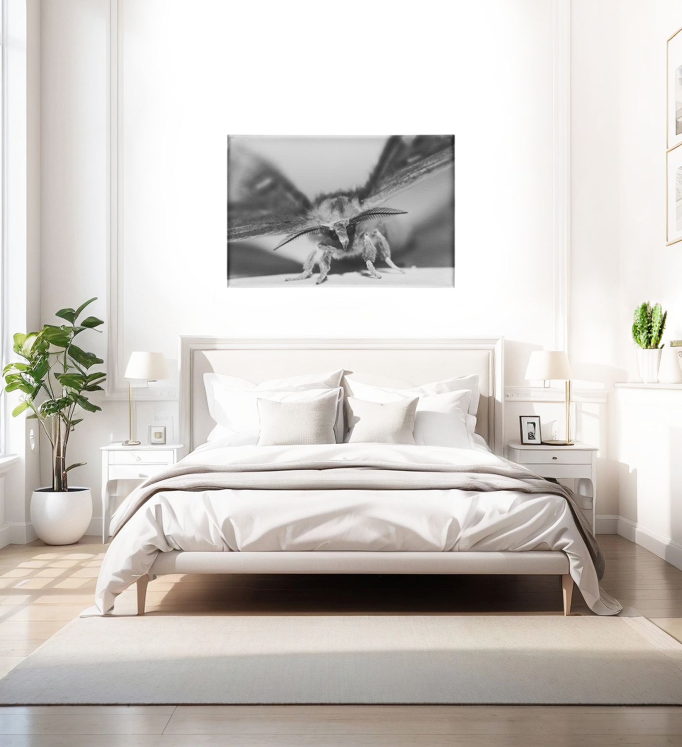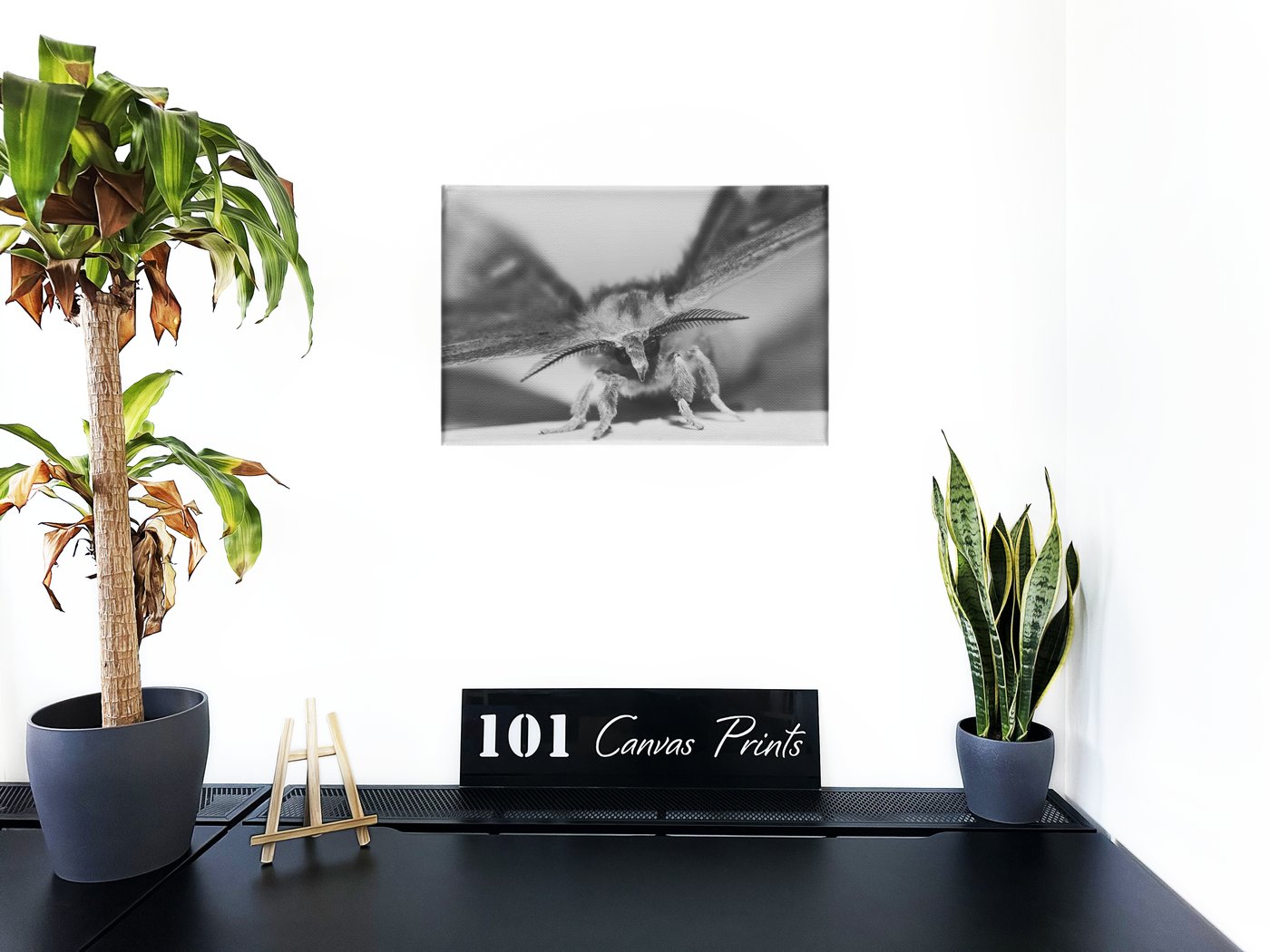 The Canvas print medium beautifully complements the photograph's textural qualities, adding a subtle tactile dimension to the visual experience. The matte finish of the Canvas softens the contrast, enhancing the dreamy, ethereal quality of the image. 101 Canvas Prints' photography team has captured the moth's otherworldly beauty, producing a piece that brings nature's hidden wonders into focus. This print is ideal for studies, creative spaces, or any area where one wishes to introduce a touch of natural curiosity and quiet contemplation.