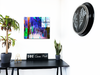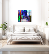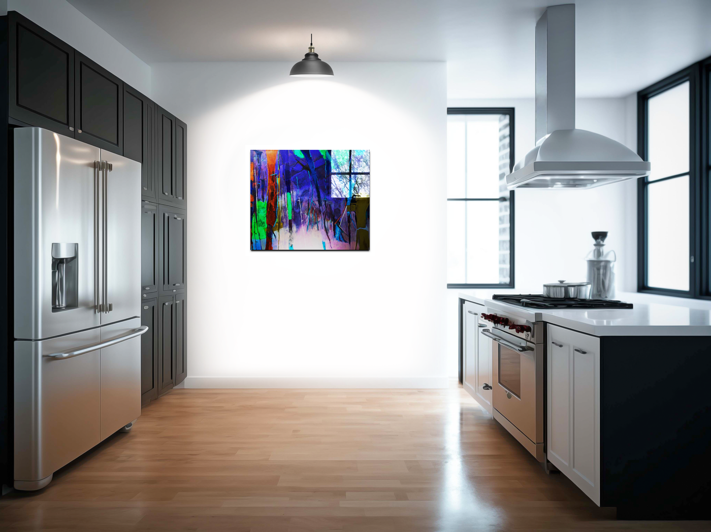 The artist's sophisticated use of colour creates a powerful visual impact, with deep blues and purples suggesting both evening shadows and the depth of memory, while bright greens and warm earth tones speak to growth and resilience. Through our precise photography and print enhancement process, we've maintained every subtle variation in tone and texture, ensuring that both the physical memory of the space and its emotional resonance are preserved with perfect clarity.