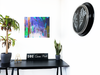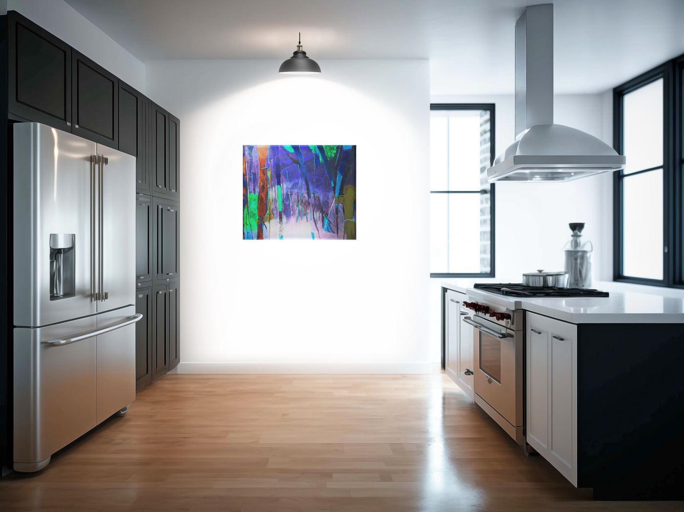 The colour palette is rich with meaning, combining deep indigos and royal purples with bursts of emerald green and touches of rusty orange that suggest both natural growth and the weathered elements of a working-class home. Our print enhancement team have preserved every nuanced brushstroke that gives this piece its emotional resonance, from the dripping vertical lines that suggest rain or tears to the ethereal ground fog that speaks to the passage of time.