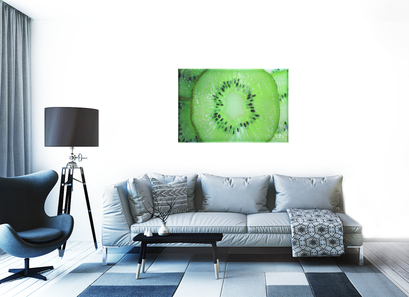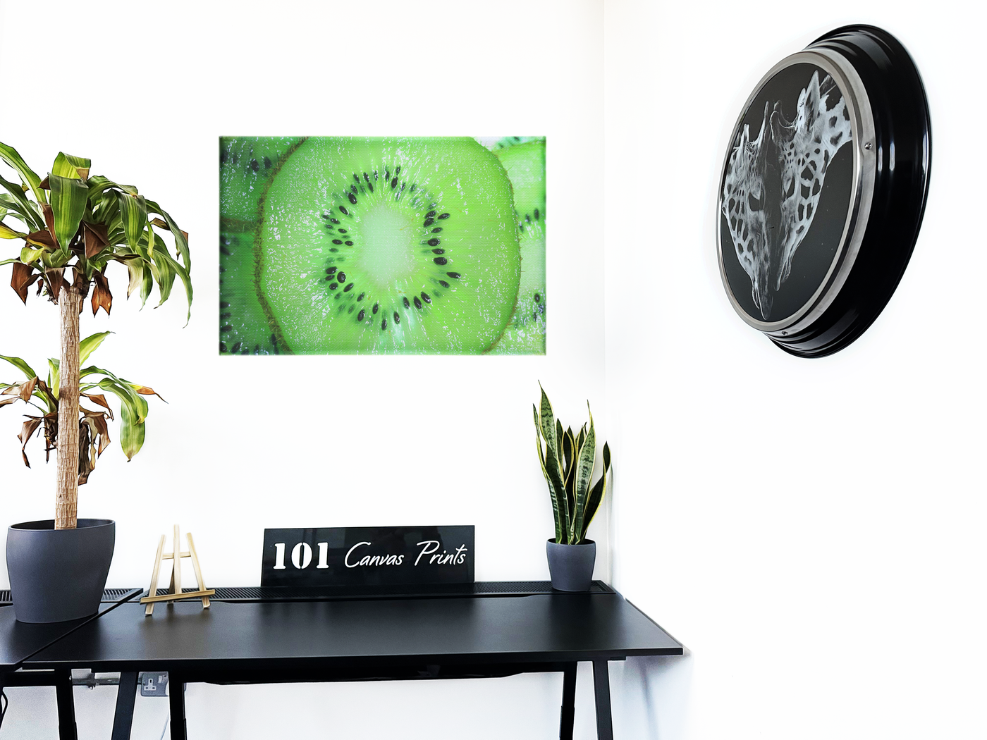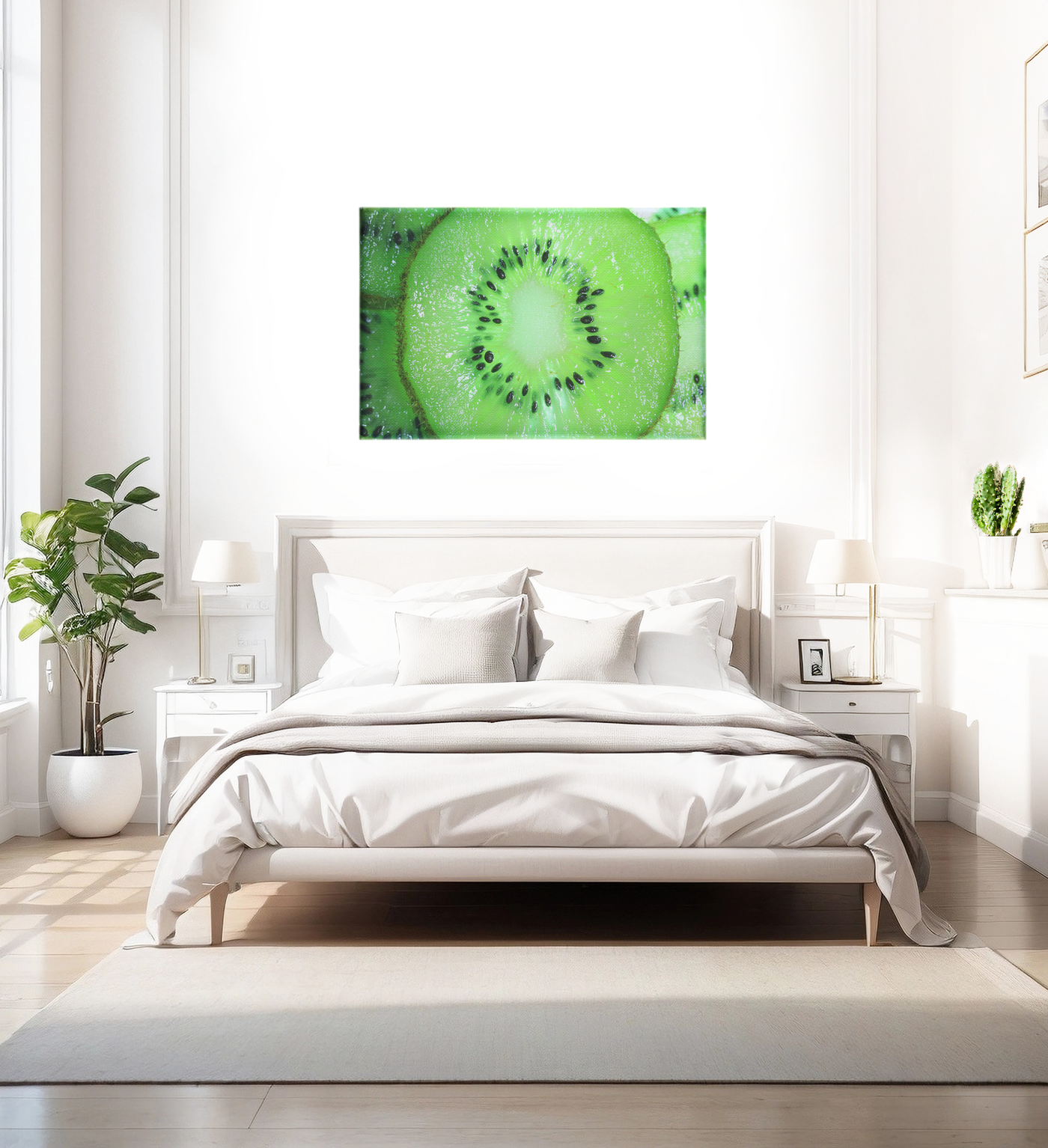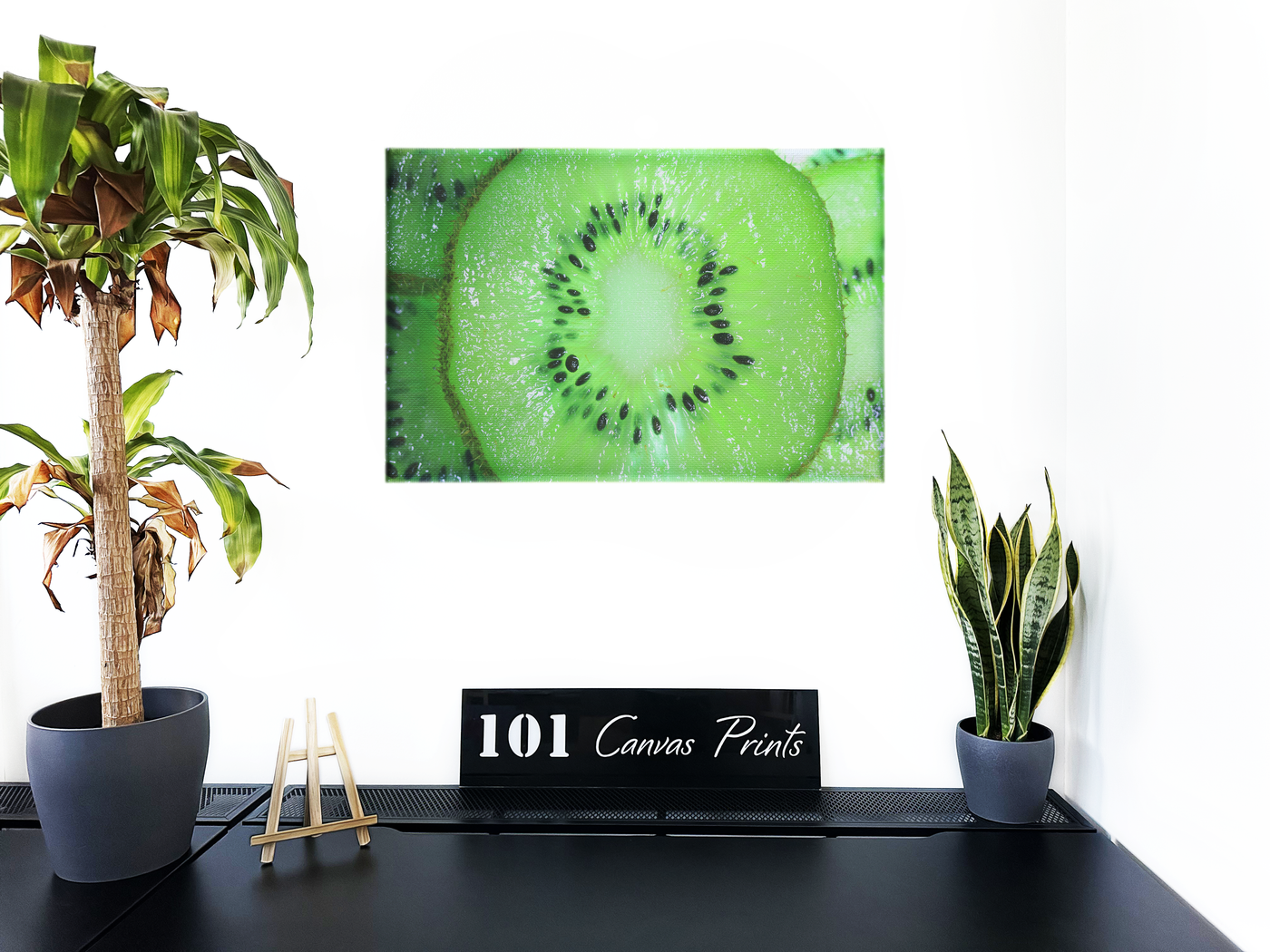 Reproduced on Canvas, this image takes on a new dimension of natural beauty. The fabric's texture subtly mimics the granular quality of the kiwi's flesh, enhancing the tactile appeal of the piece. The matte finish of the Canvas softens the bright greens, creating a more organic, true-to-life representation of the fruit. This print would be a perfect addition to a modern kitchen or dining area, its fresh, vibrant imagery evoking feelings of health and vitality. It could also serve as an intriguing focal point in a home gym or yoga studio, its circular composition promoting a sense of balance and wholeness.
