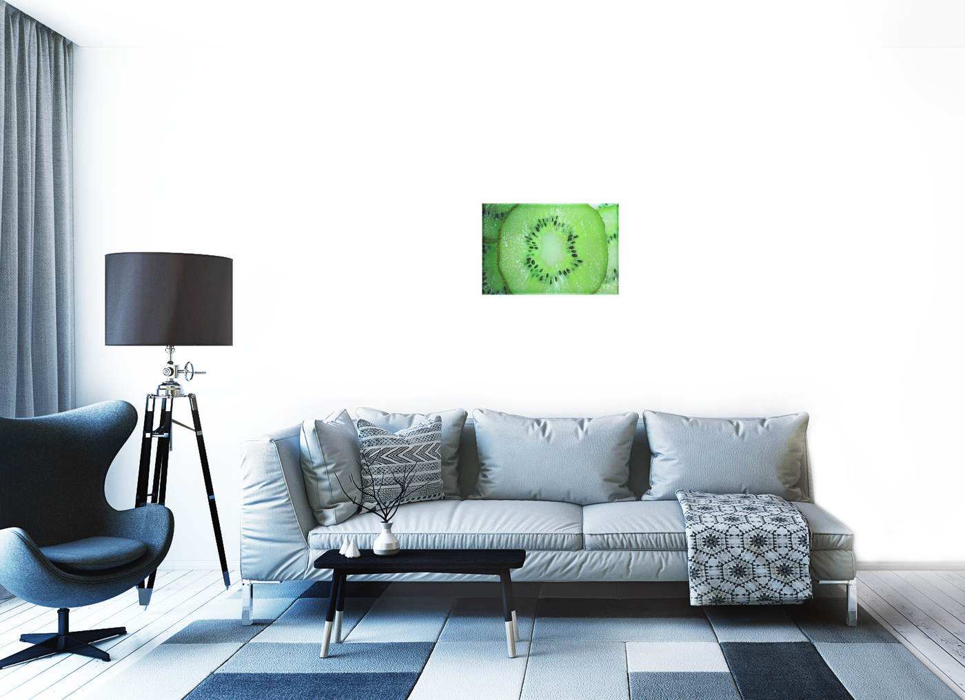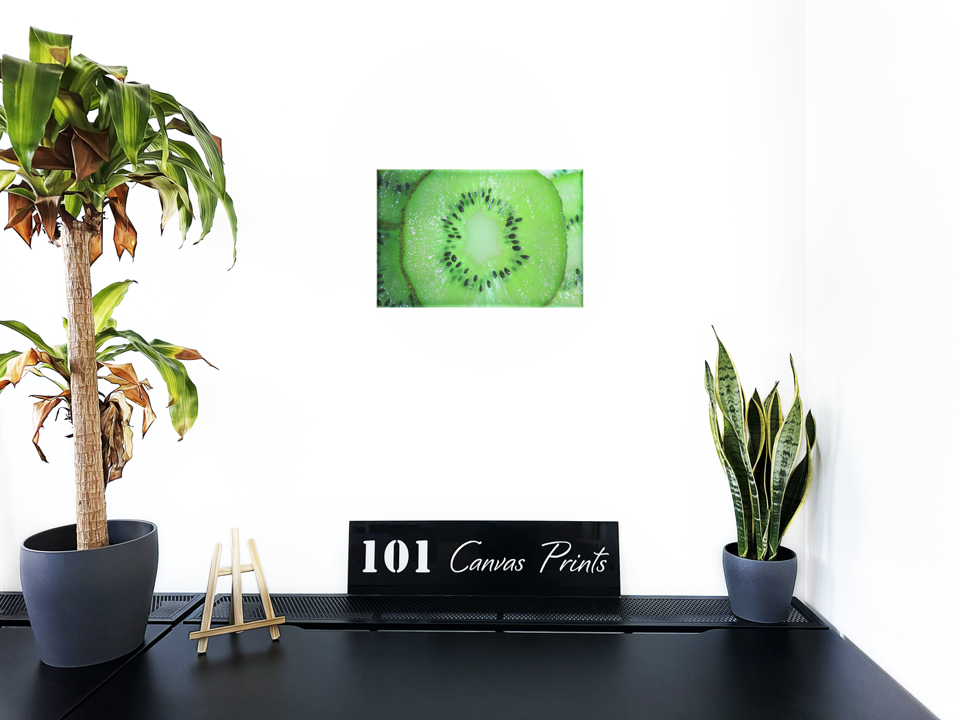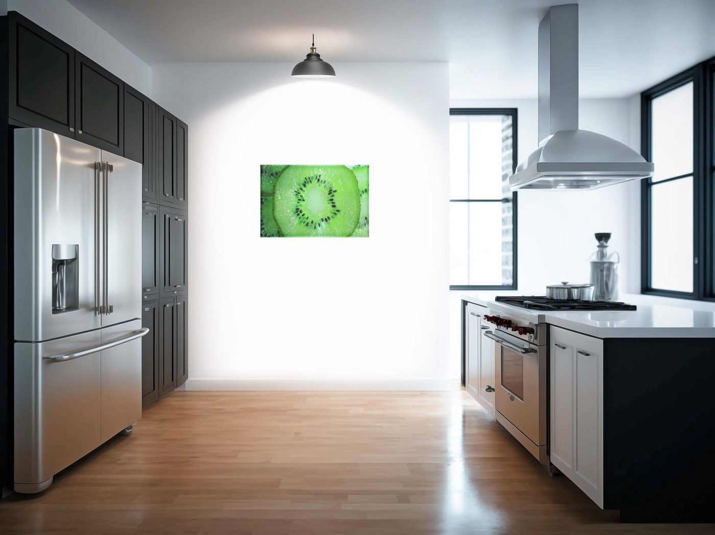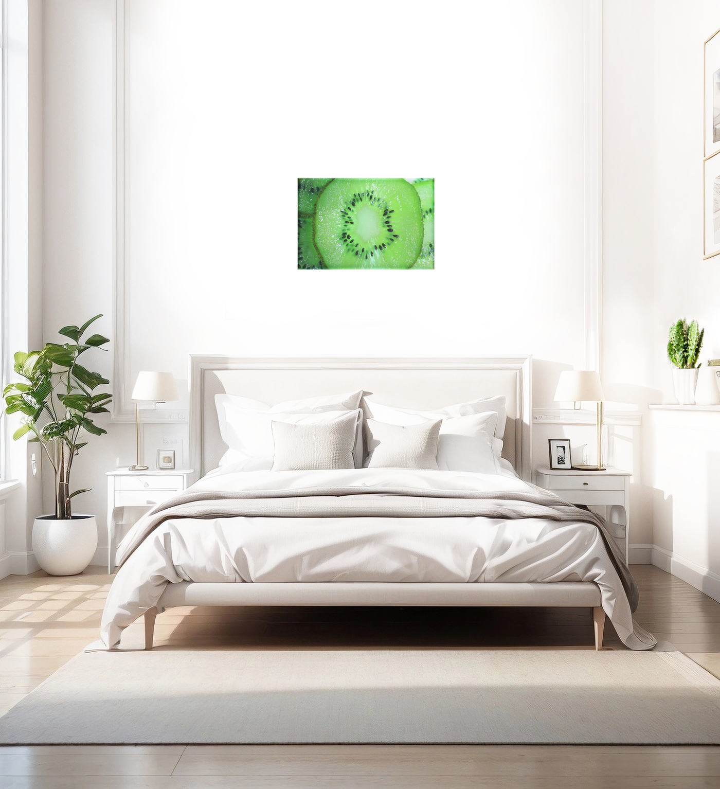 Reproduced on Canvas, this image takes on a new dimension of natural beauty. The fabric's texture subtly mimics the granular quality of the kiwi's flesh, enhancing the tactile appeal of the piece. The matte finish of the Canvas softens the bright greens, creating a more organic, true-to-life representation of the fruit. This print would be a perfect addition to a modern kitchen or dining area, its fresh, vibrant imagery evoking feelings of health and vitality. It could also serve as an intriguing focal point in a home gym or yoga studio, its circular composition promoting a sense of balance and wholeness.