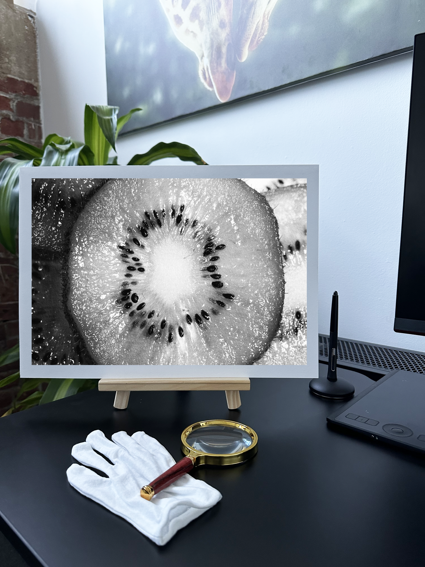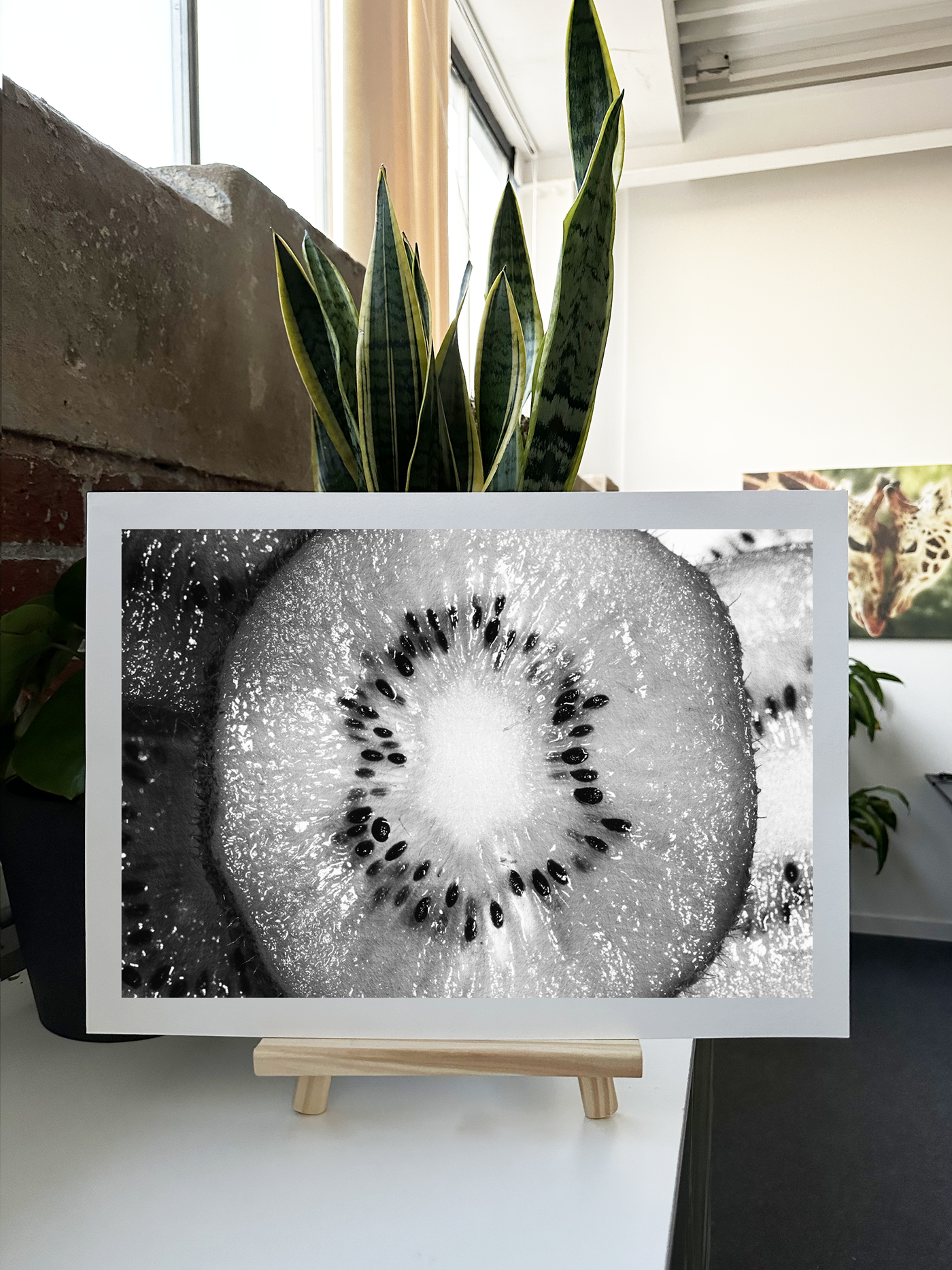 Reproduced on Fine Art paper, this image takes on a new dimension of natural beauty. The Monochrome Fine Art print texture subtly mimics the granular quality of the kiwi's flesh, enhancing the tactile appeal of the piece. The matte finish of the Fine Art paper softens the bright greys, creating a more organic, true-to-life representation of the fruit. This print would be a perfect addition to a modern kitchen or dining area, its fresh, vibrant imagery evoking feelings of health and vitality. It could also serve as an intriguing focal point in a home gym or yoga studio, its circular composition promoting a sense of balance and wholeness.