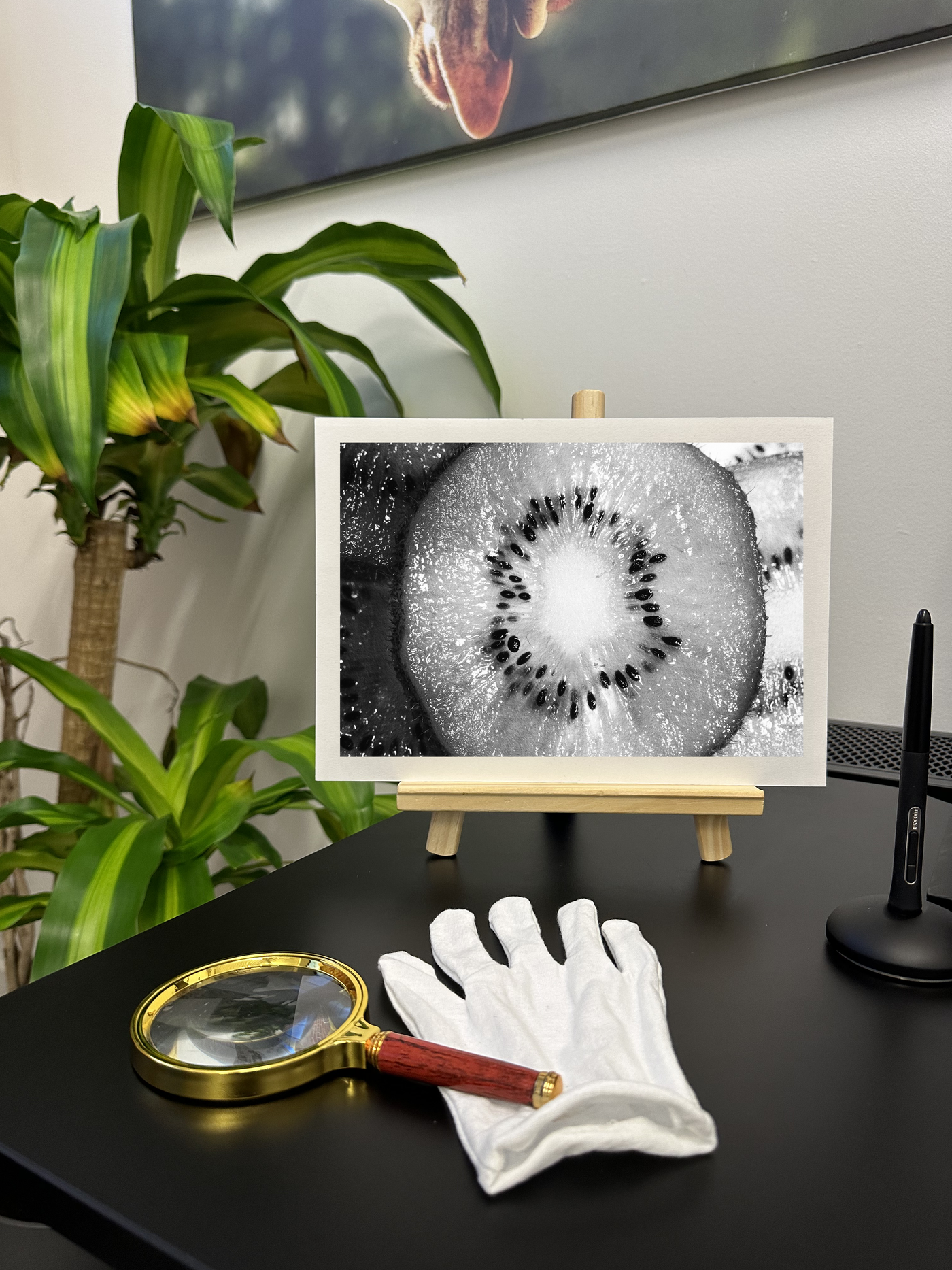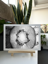 Reproduced on Fine Art paper, this image takes on a new dimension of natural beauty. The Monochrome Fine Art print texture subtly mimics the granular quality of the kiwi's flesh, enhancing the tactile appeal of the piece. The matte finish of the Fine Art paper softens the bright greys, creating a more organic, true-to-life representation of the fruit. This print would be a perfect addition to a modern kitchen or dining area, its fresh, vibrant imagery evoking feelings of health and vitality. It could also serve as an intriguing focal point in a home gym or yoga studio, its circular composition promoting a sense of balance and wholeness.