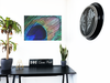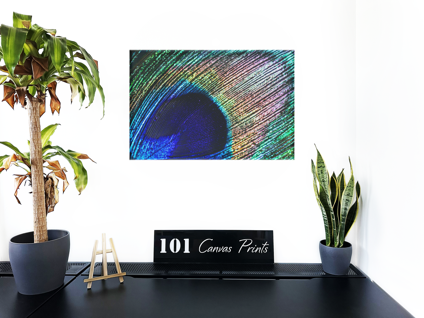 The colour palette is a spectacular display of nature's artistry, expertly rendered by the 101 Canvas Prints team. A deep, royal blue dominates the central eye, gradually transitioning to electric turquoise, then giving way to a mesmerising array of greens, golds, and subtle pinks. The lighting technique employed by the photographers accentuates the feather's iridescent quality, creating a shimmering effect that seems to bring the image to life. The intricate texture of the barbules is captured in stunning detail, revealing the complex structure that creates the feather's unique, eye-catching appearance.