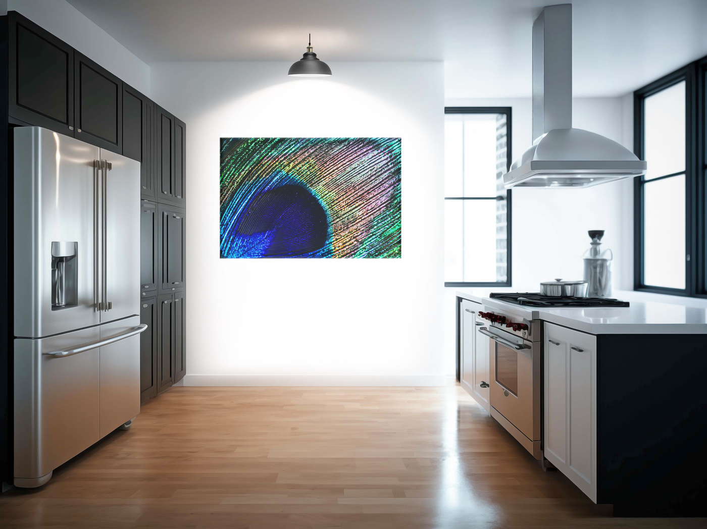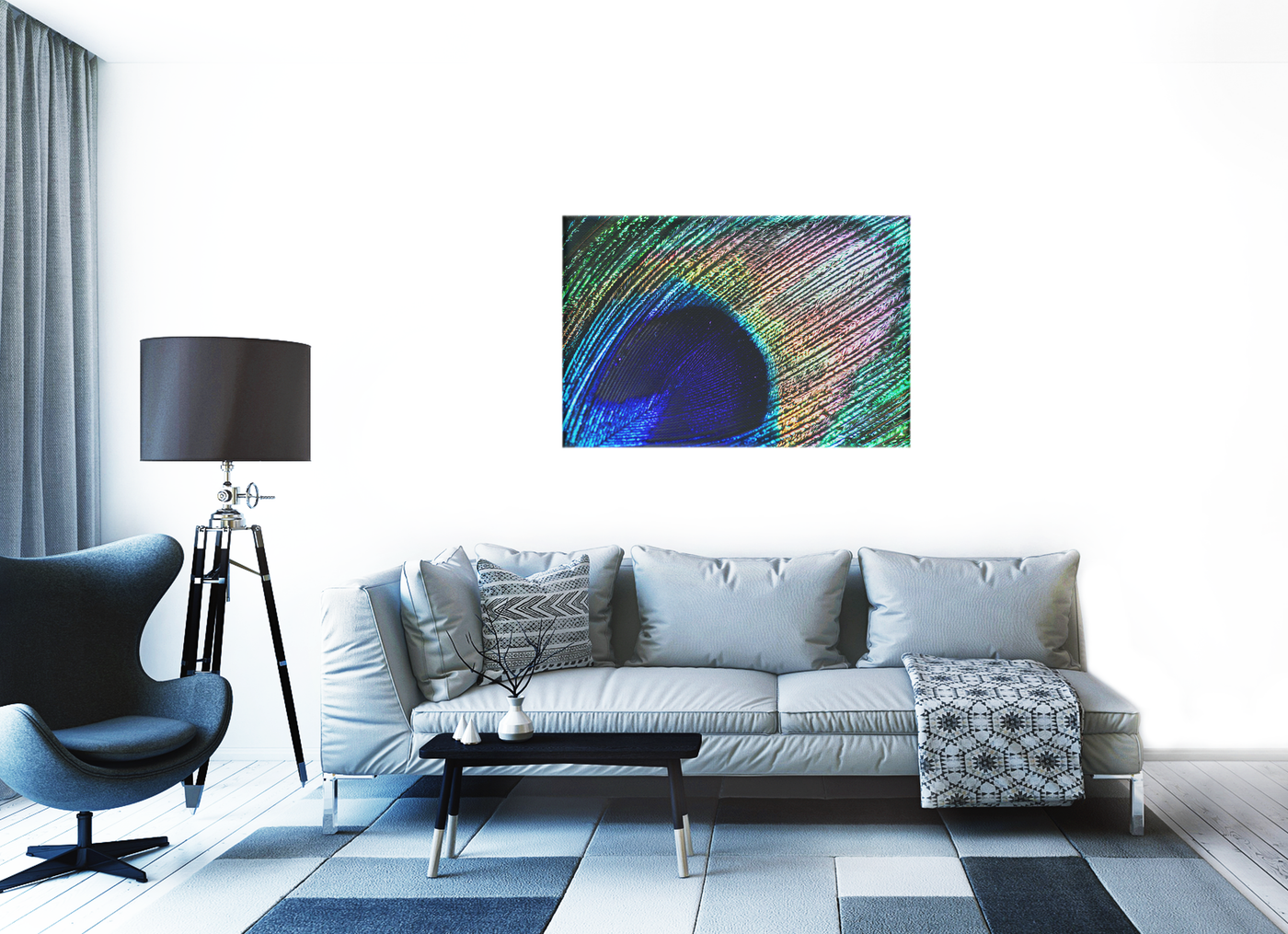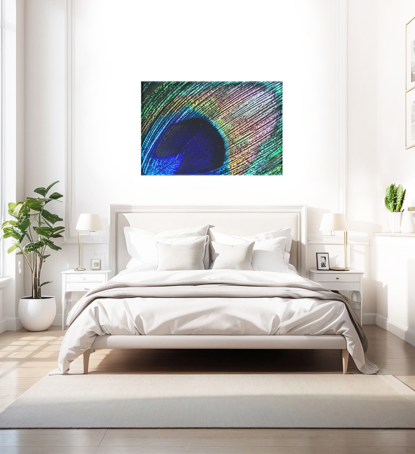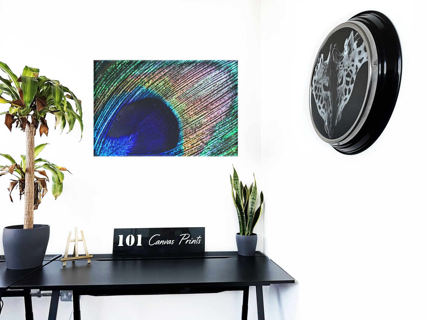 When printed on Canvas by the skilled 101 Canvas Prints team, this image takes on a captivating tactile quality. The natural texture of the Canvas complements the organic subject matter, softening the colours slightly for a more nuanced, artistic effect. This medium enhances the feather's matte areas while preserving its natural lustre. The result is a striking piece that would be perfect for a living room, bedroom, or any space where its vibrant hues and intricate details can be fully appreciated, making it an ideal choice for nature enthusiasts or those looking to add a touch of exotic beauty to their décor.